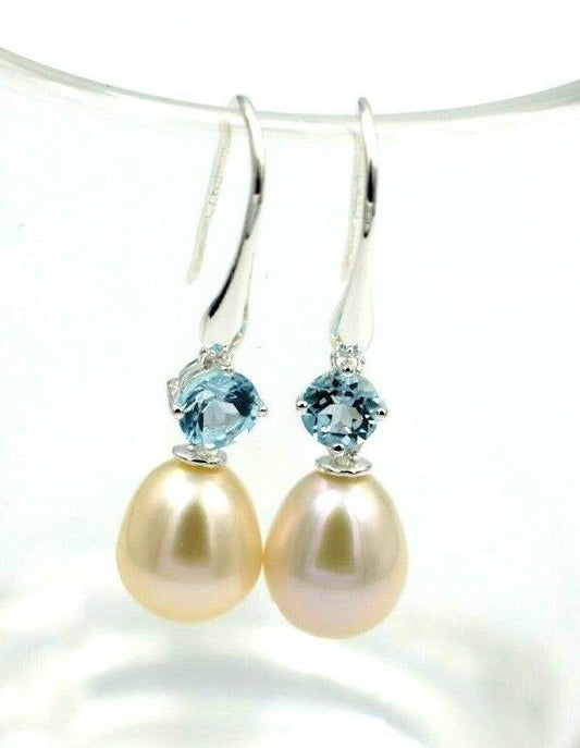 Oval Freshwater Cultured Pearl with 4-Claw 5mm Natural Blue Topaz Hook Earrings