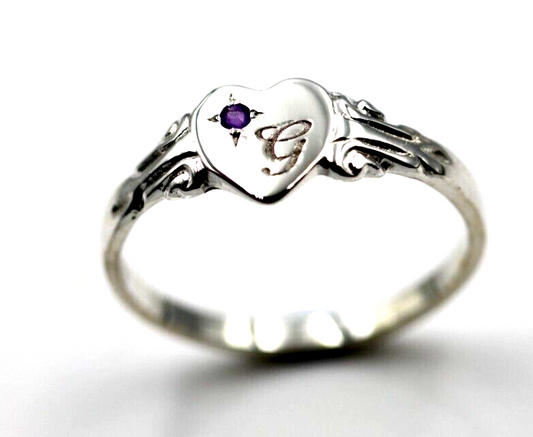 Sterling Silver Heart Amethyst Set Signet Ring Size N Engraved With 1 Initial