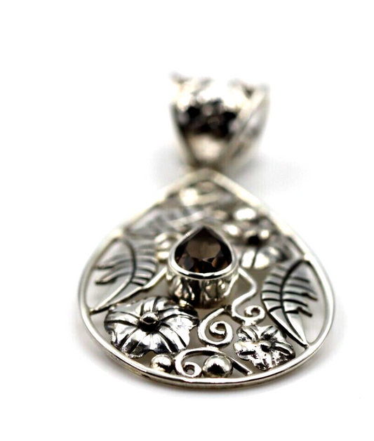 Sterling Silver Flower Filigree Smoky Quartz Teardrop Pendant