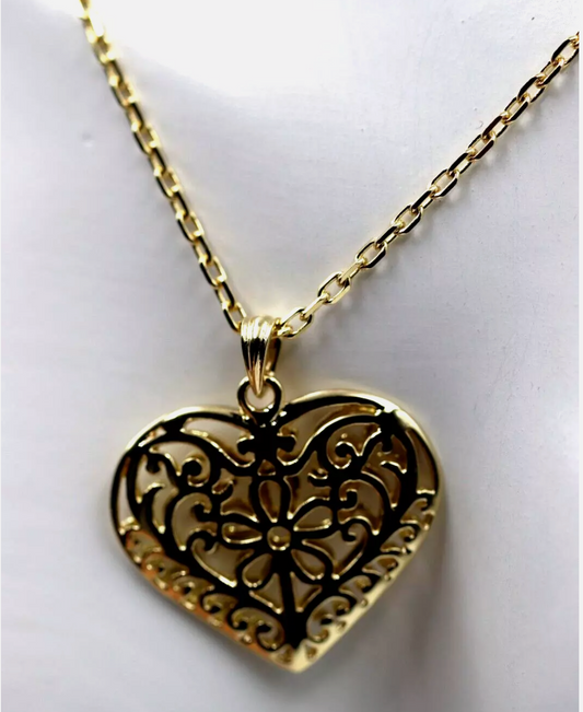 18ct Large Yellow Gold Filigree Double Sided Heart Pendant + 60cm Necklace