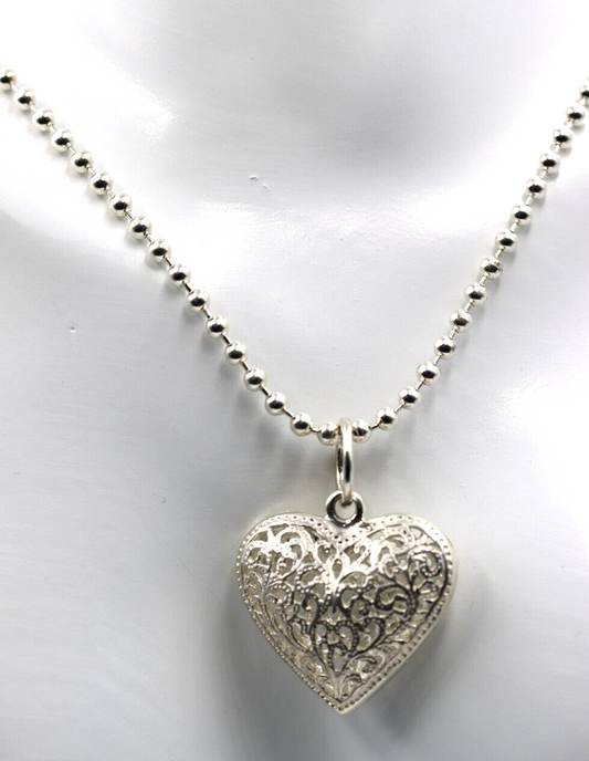 Genuine Sterling Silver 73cm Ball Necklace & Large Heart Pendant