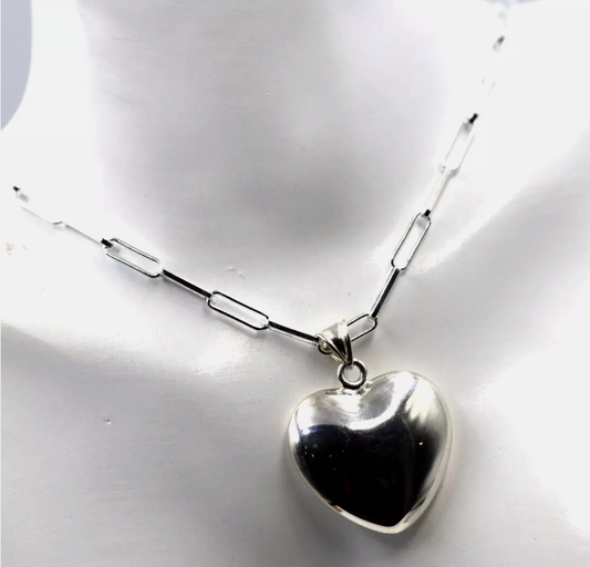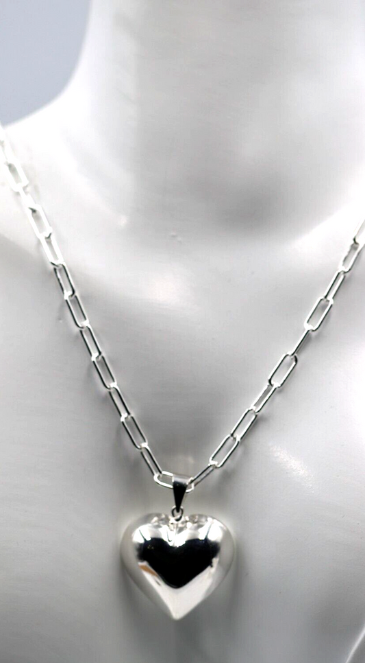 Sterling Silver 925 Paperclip Necklace + Large Puffy Heart Pendant