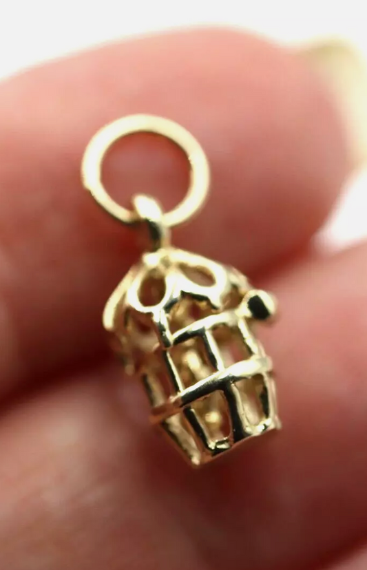 Kaedesigns Small 9ct Yellow Gold Solid Bird Cage with Bird Pendant or Charm