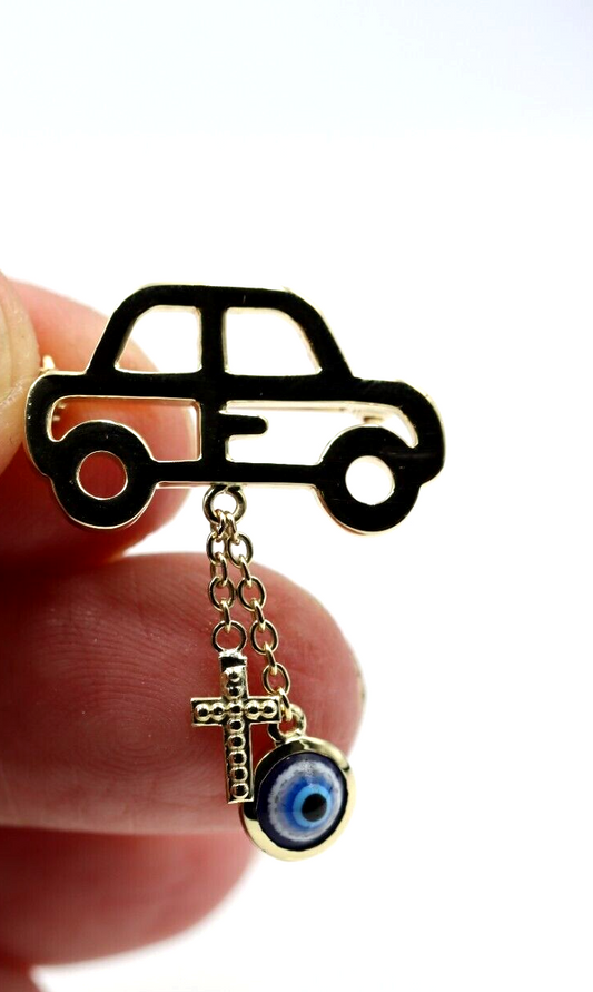 Genuine 9ct, 14ct or 18ct Yellow Gold Baby Child's Kids Car Cross Brooch Evil Eye Mati