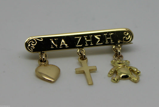 Genuine 9ct, 14ct or 18ct Yellow Gold Baby Child's Kids Heart Cross Brooch Evil Eye Mati