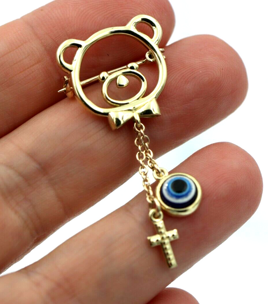 Genuine 14ct Yellow Gold Baby Child's Kids Teddy Bear Cross Brooch Evil Eye Mati