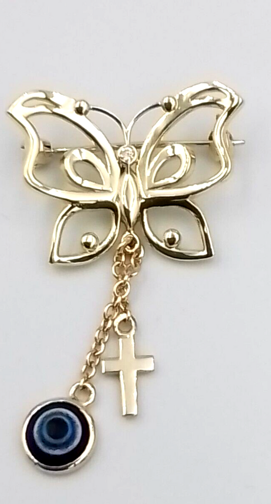 Genuine 9ct, 14ct or 18ct Yellow Gold Baby Child's Kids Butterfly Diamond Cross Brooch Evil Eye Mati