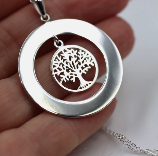 Sterling Silver Open Circle Engraving Disc Pendant + ‘Tree of Life’ + 40cm Chain
