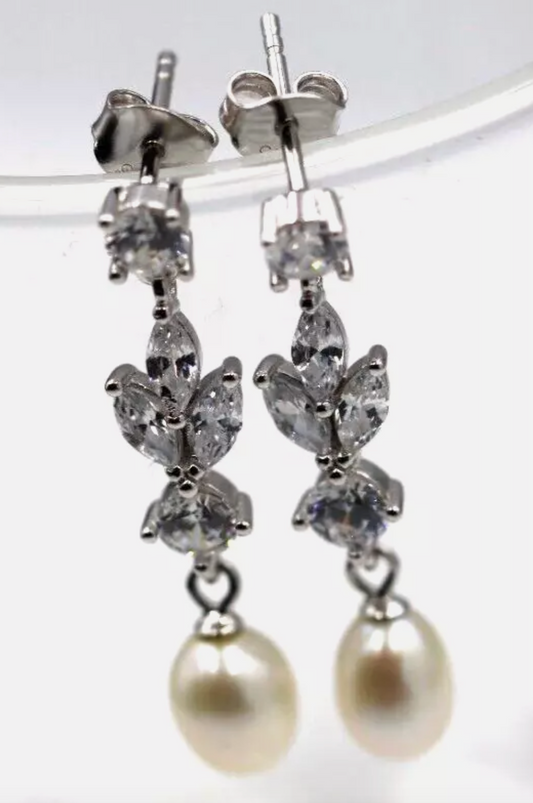 Sterling Silver CZ-Set Shell Pearl Drop Post Chandelier Earrings