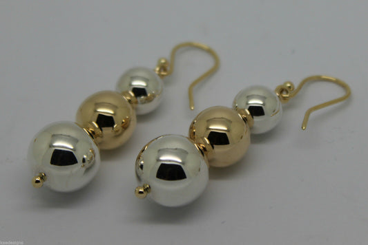 Genuine 9k 9ct White & Yellow Gold Spinning Belcher Ball Continental Hooks Drop Earrings