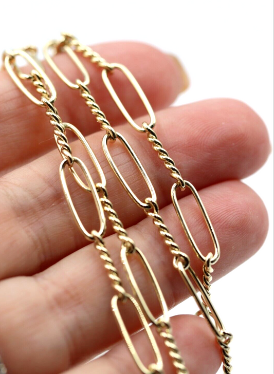 Genuine 65cm 14ct Yellow Gold Paper Clip Chain Necklace Bolt Ring Beaded charms