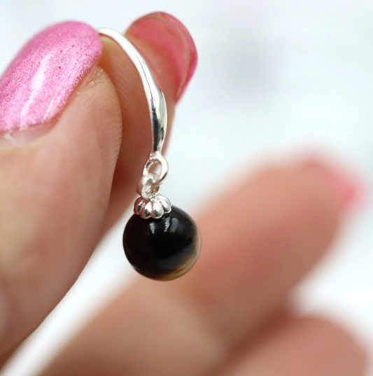 Sterling Silver 925 8mm Tiger's Eyes Ball Drop Hook Earrings