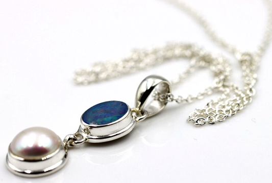 Genuine Sterling Silver Freshwater Pearl & Opal Pendant Belcher + Chain