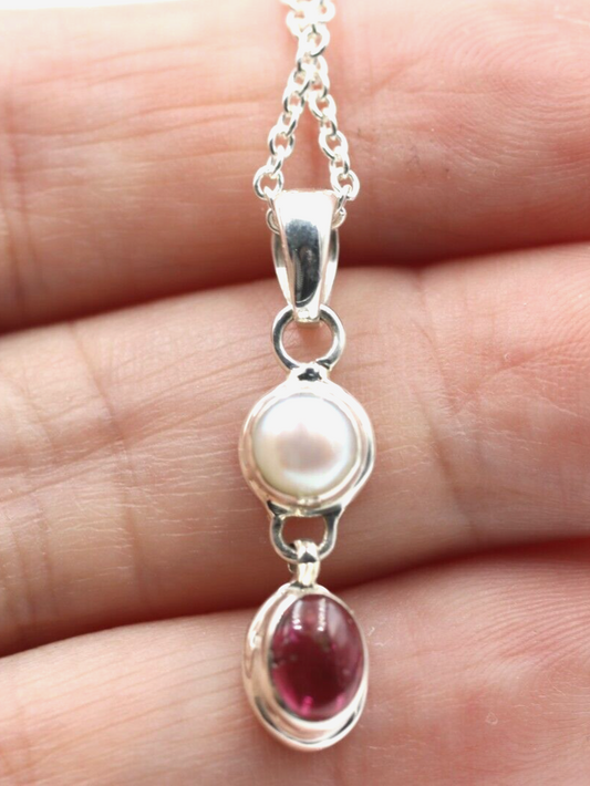 Sterling Silver Freshwater Pearl & Tourmaline Pendant Belcher Chain