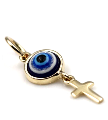 Genuine 9ct Yellow, Rose or White Gold Greek Mati Nazar Lucky 5mm Evil Eye + Cross Charm or Pendant