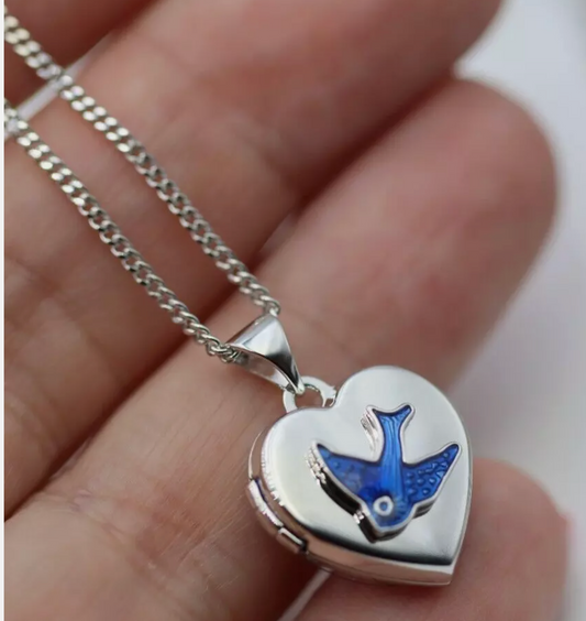 Sterling Silver 925 Heart Enamel Blue Bird Locket Pendant + Necklace Chain