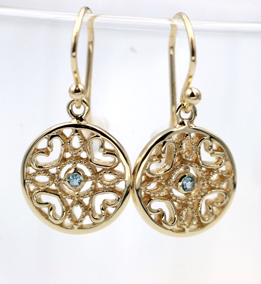 Genuine 9ct Yellow, Rose or White Gold Topaz Disc Heart Filigree Hook Earrings