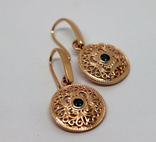 Genuine 9ct Solid Yellow, Rose or White Gold Round London Blue Topaz Filigree Earrings