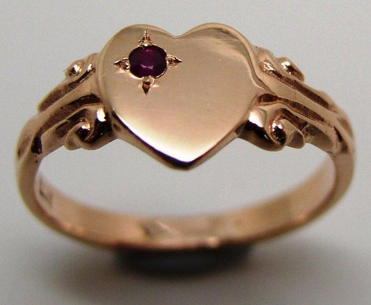 Genuine Solid 9ct Rose Gold Ruby Stone Heart Signet Ring -July Birthstone
