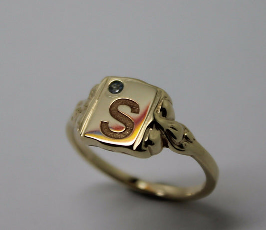 Size L, Genuine Solid 9ct 9kt Yellow, Rose or White Gold Signet Ring + Aquamarine + One Initial
