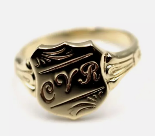 Size T1/2, 9ct 9kt Yellow, Rose or White Gold Shield Signet Ring + Engraving of one initial
