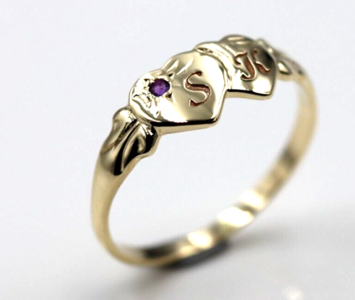 Genuine 9ct Yellow Gold Double Heart Yellow Purple Amethyst February Birthstone Signet Ring In your size + Engraving