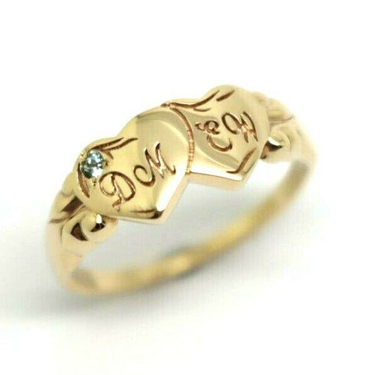 Genuine 9ct 9k Yellow, Rose or White Gold Double Heart Blue Topaz Birthstone Signet Ring + Engraving