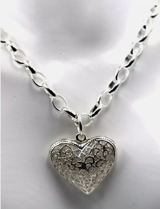 Heavy Sterling Silver 50cm Belcher Necklace & Filigree Heart Pendant