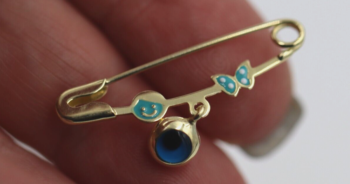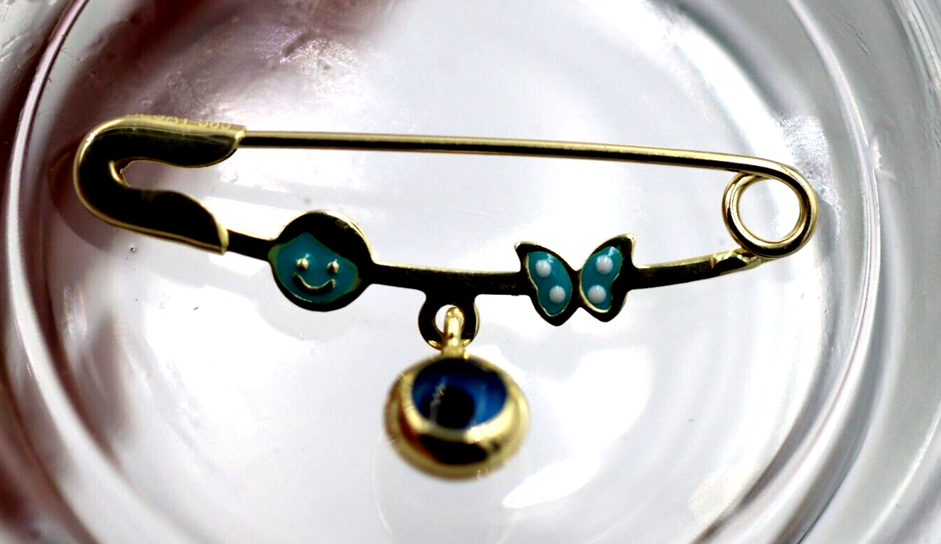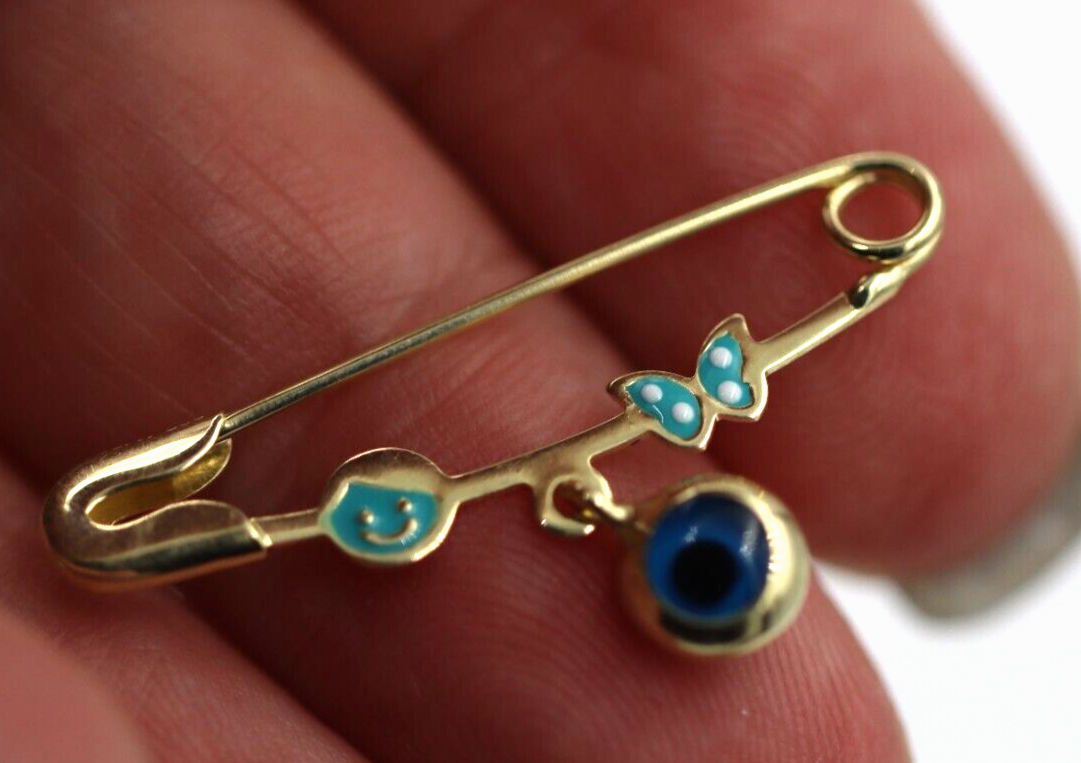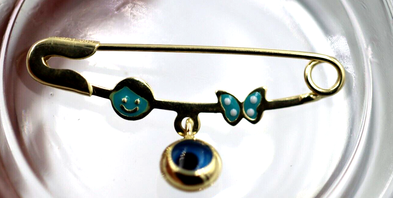 14ct Yellow Gold Baby Child's Kids Cubic Zirconia Brooch Evil Eye Mati