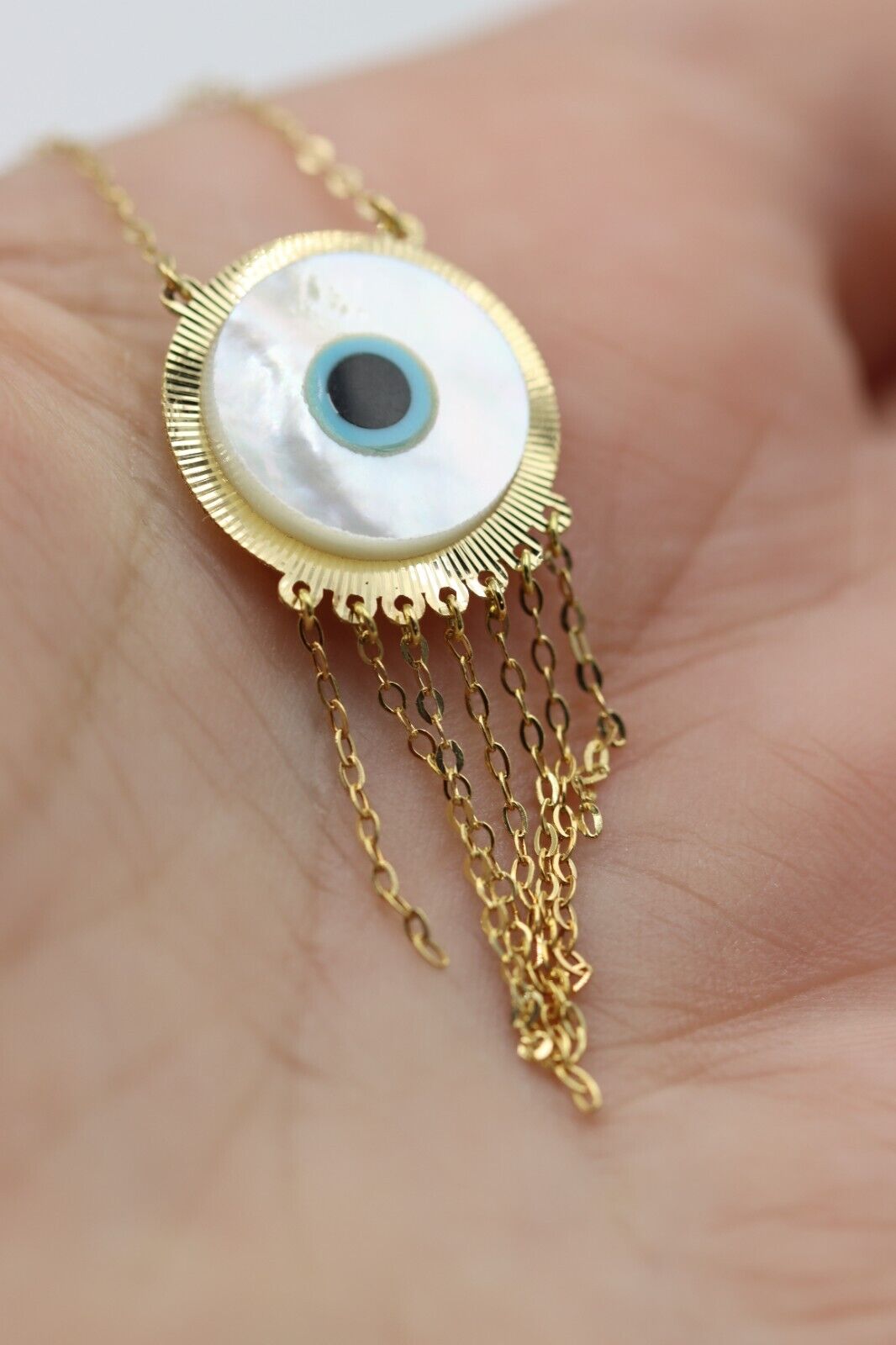 This elegant 18ct 750 Yellow Gold necklace is a classic adornment. Crafted with Mother of Pearl and a Greek Eye detail, it is a beautiful addition to any wardrobe. Enjoy free post when you purchase today.