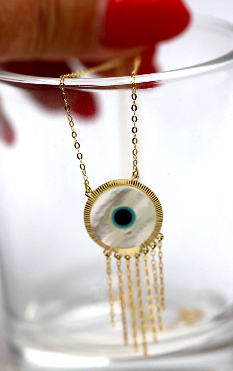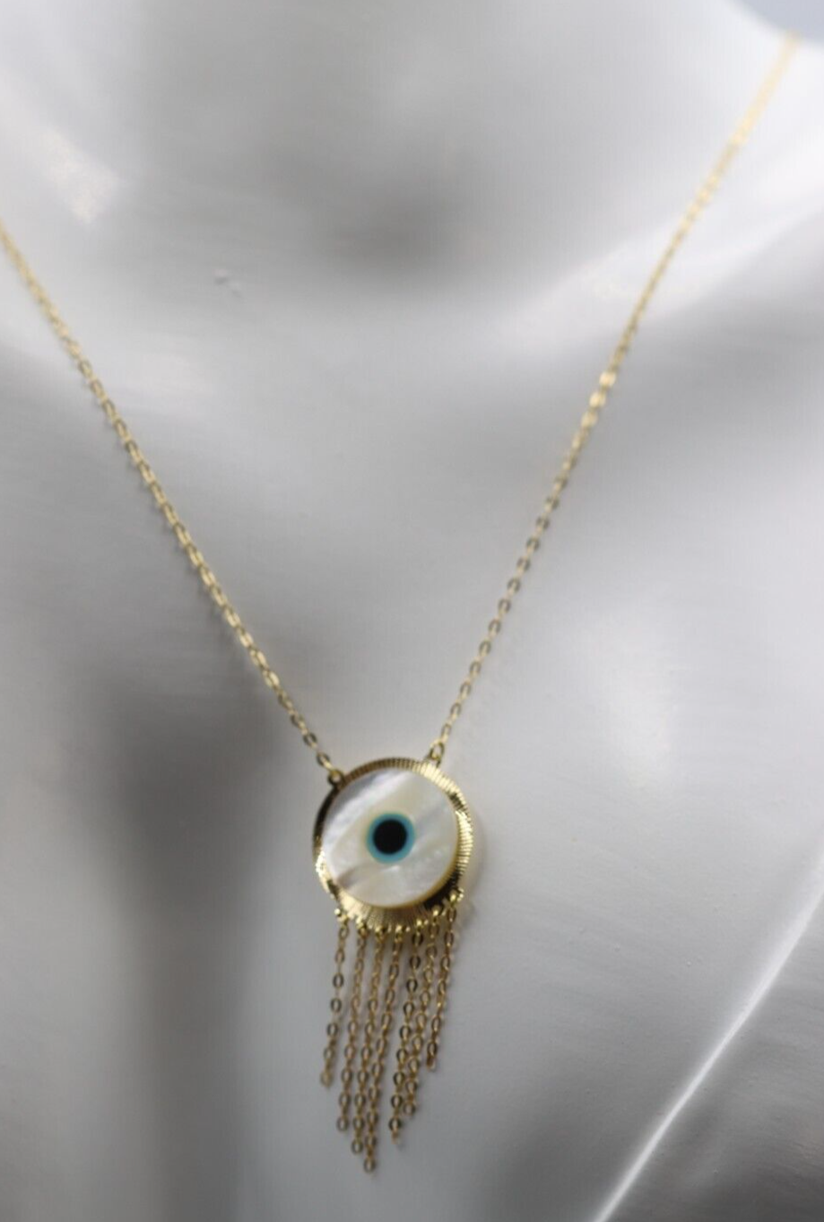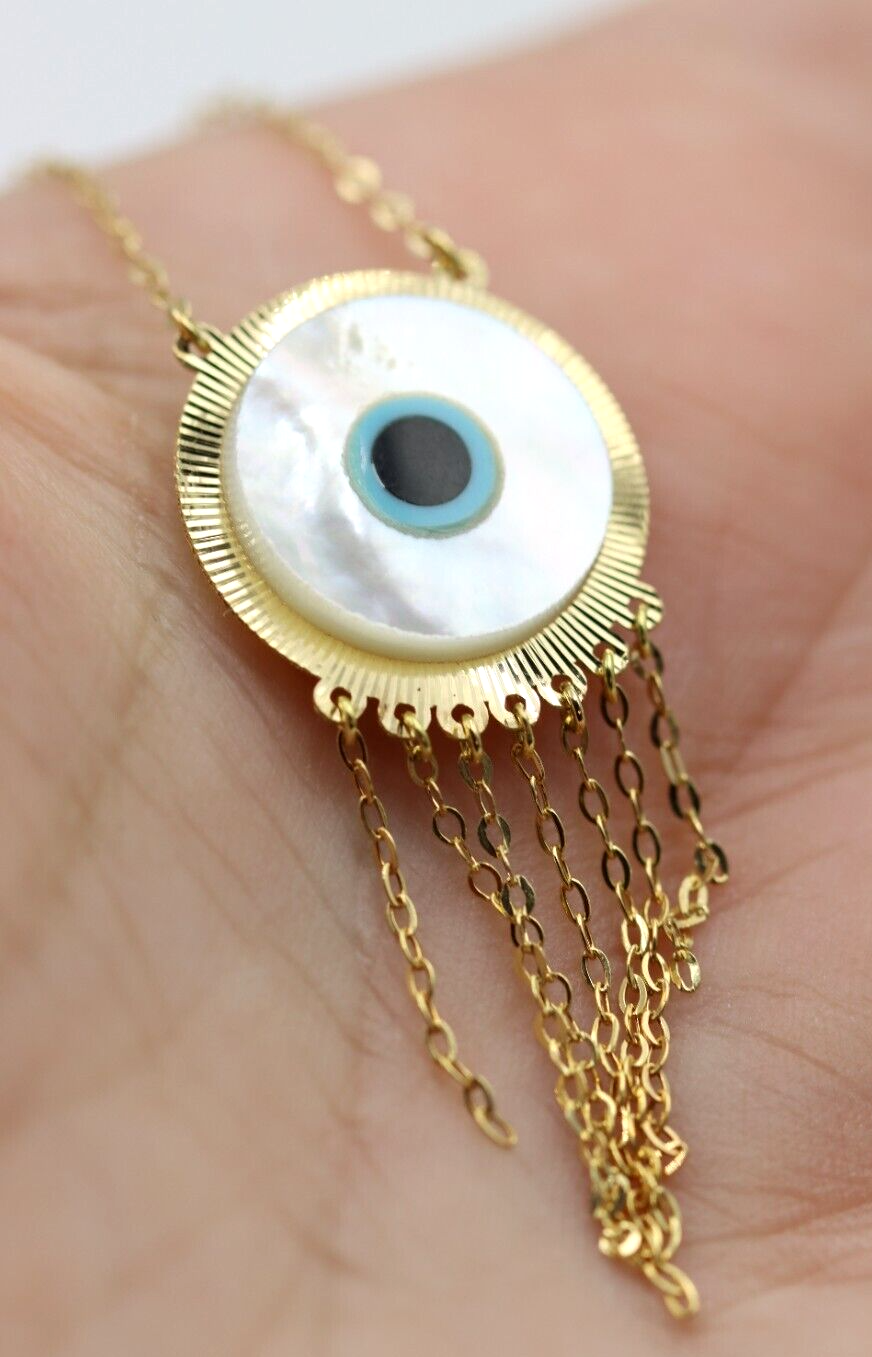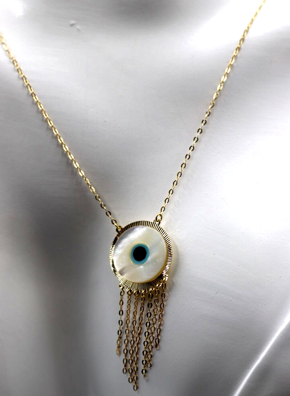 18ct 750 Gold Yellow Gold 43cm Mother Pearl Greek Eye Necklace Chain