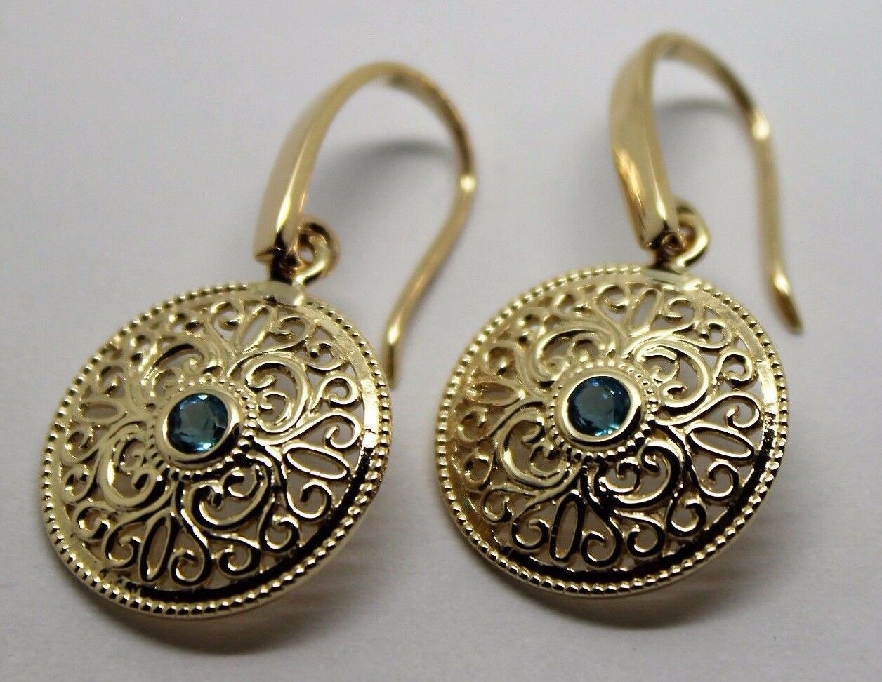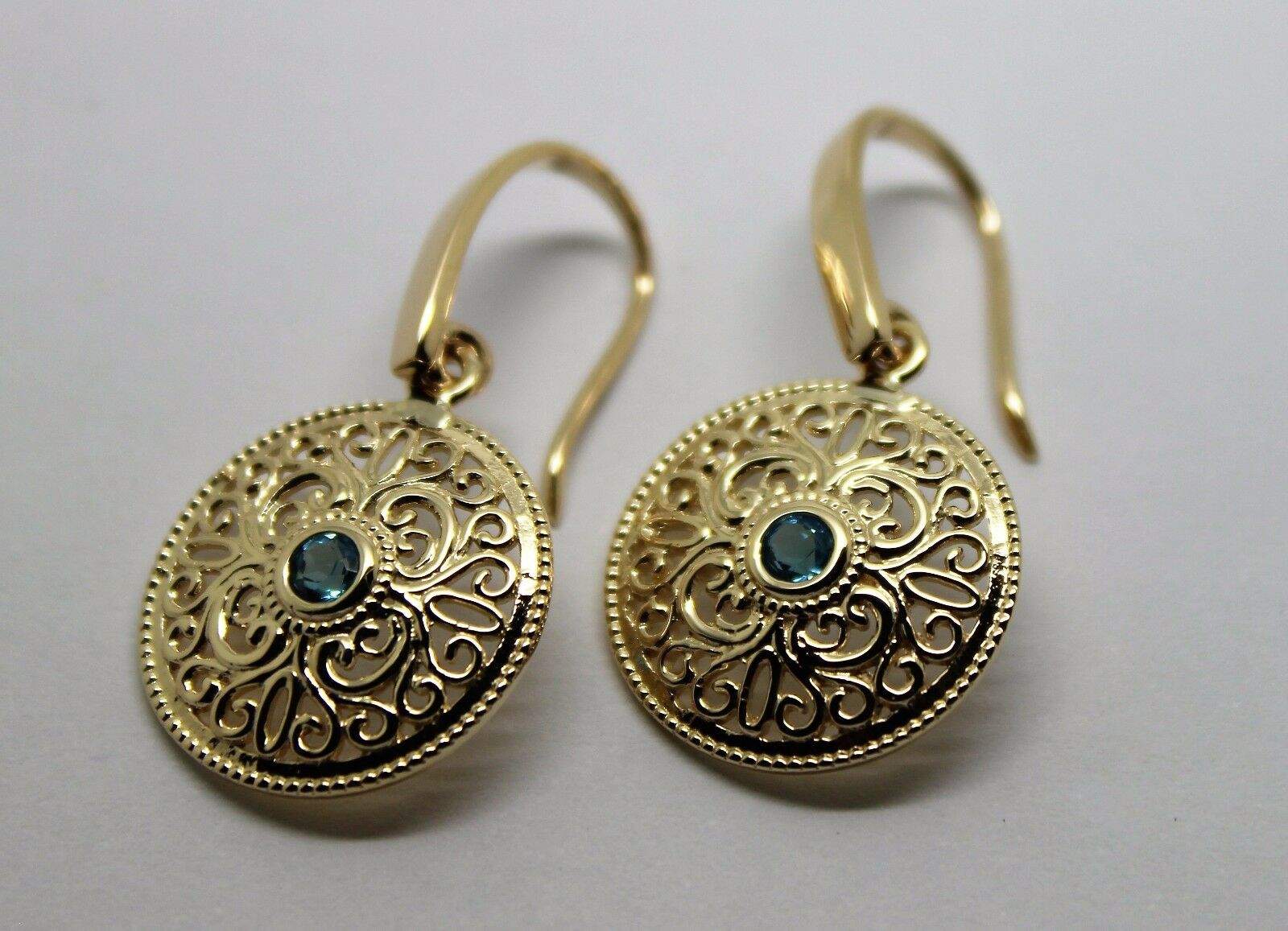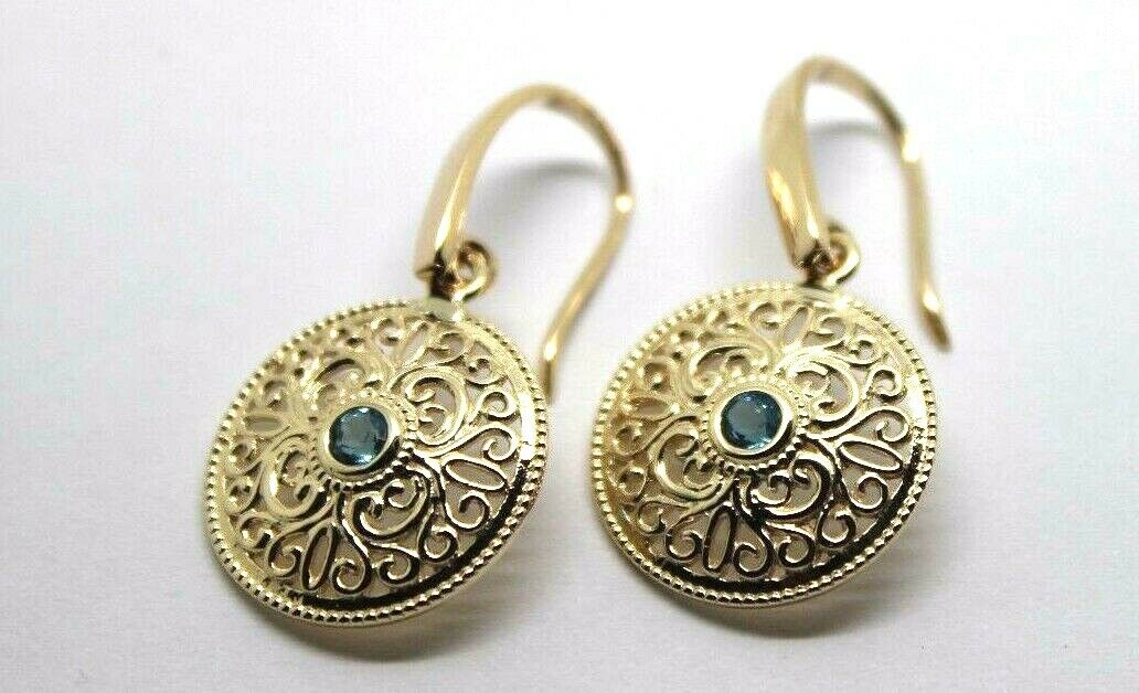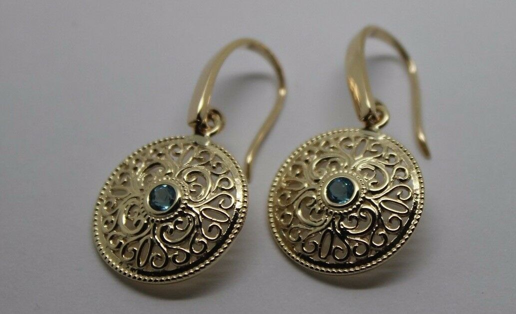 Genuine 9ct Solid Yellow, Rose or White Gold Blue Topaz Filigree Round Drop Earrings