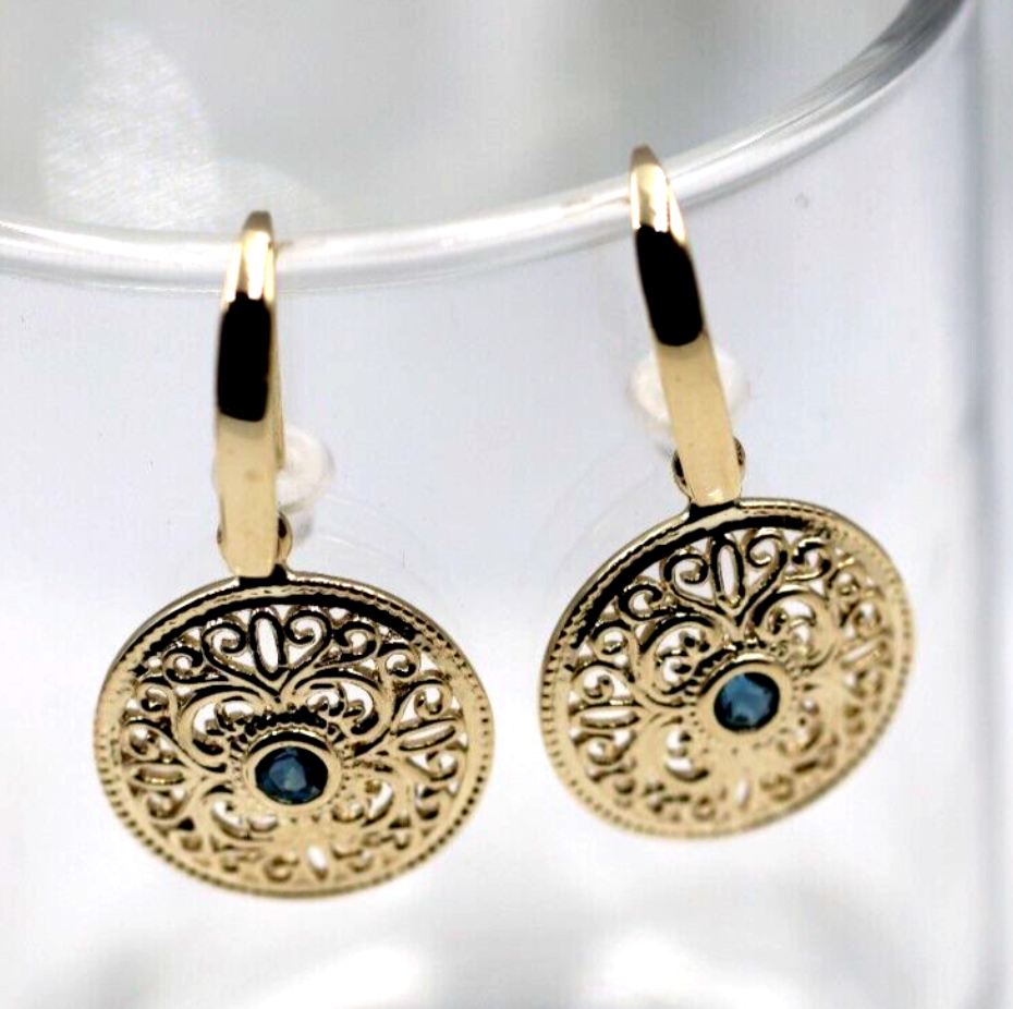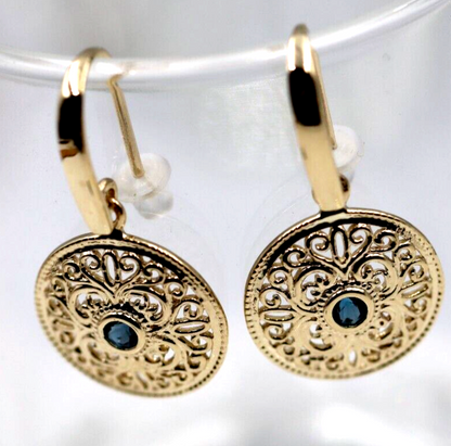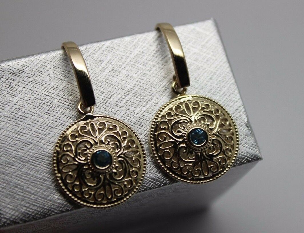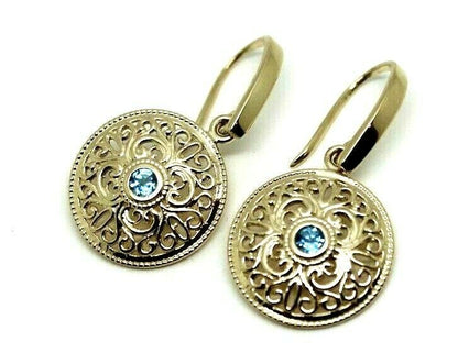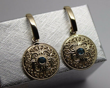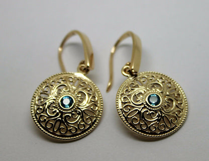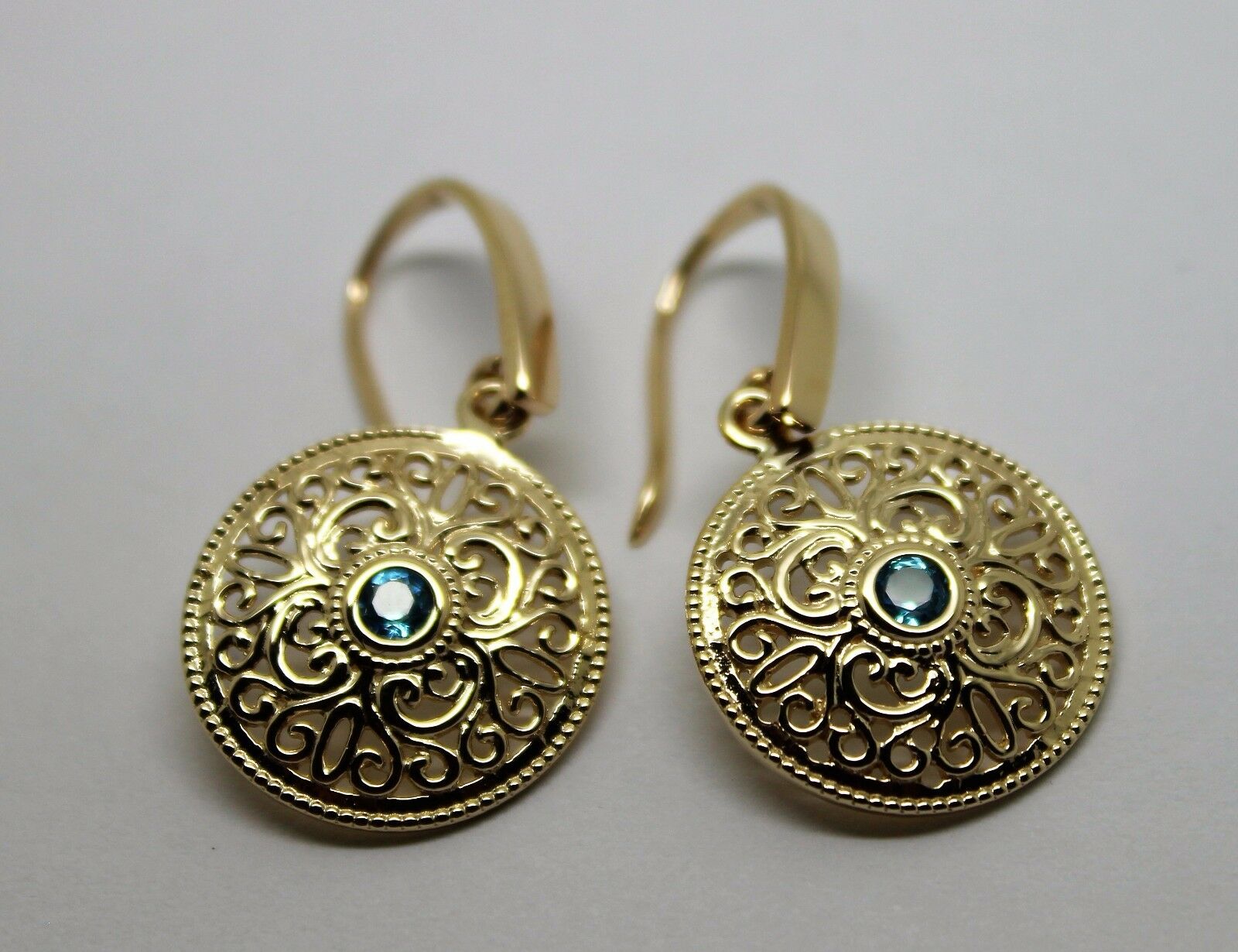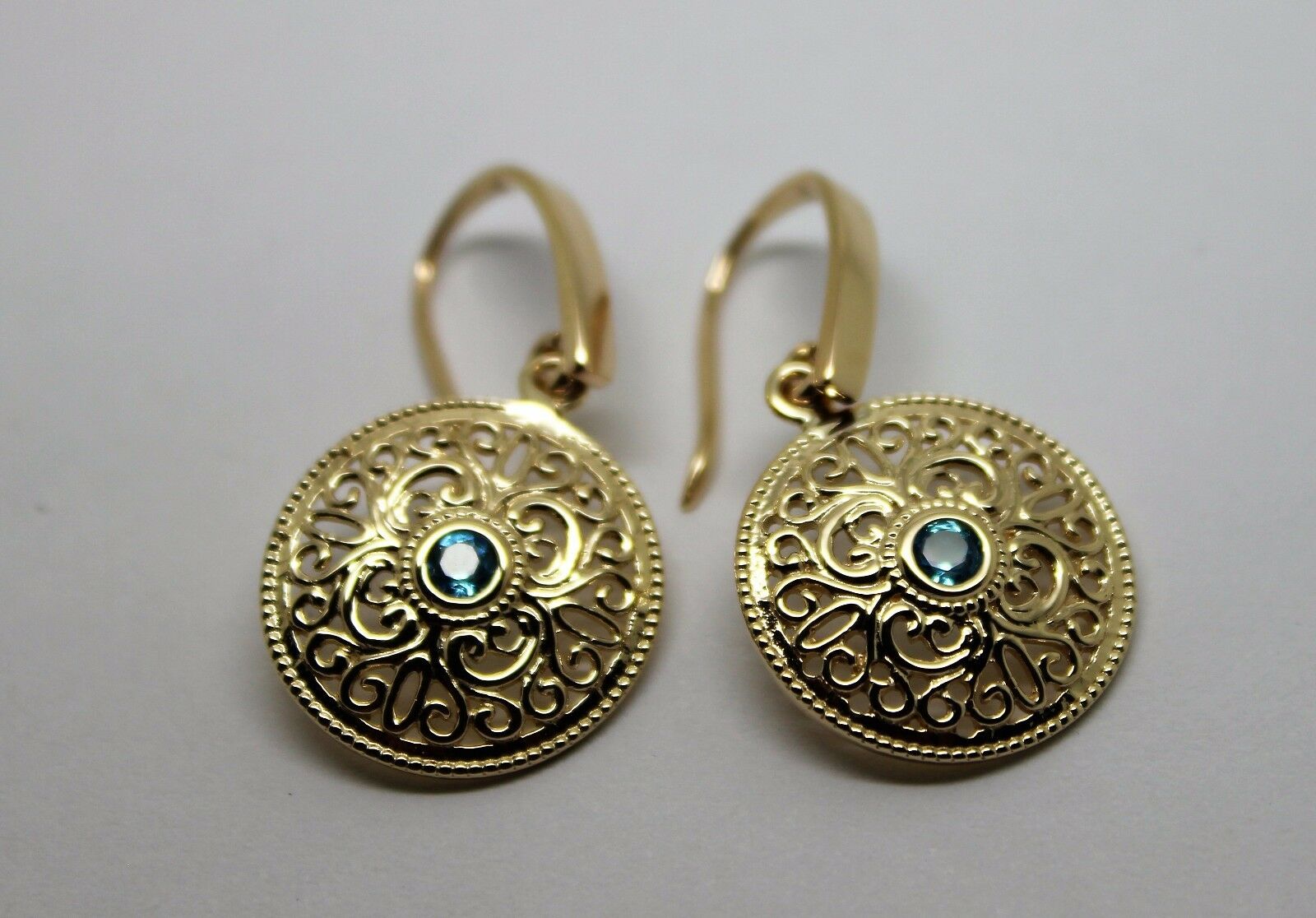 Genuine 9ct Solid Yellow, Rose or White Gold Blue Topaz Filigree Round Drop Earrings