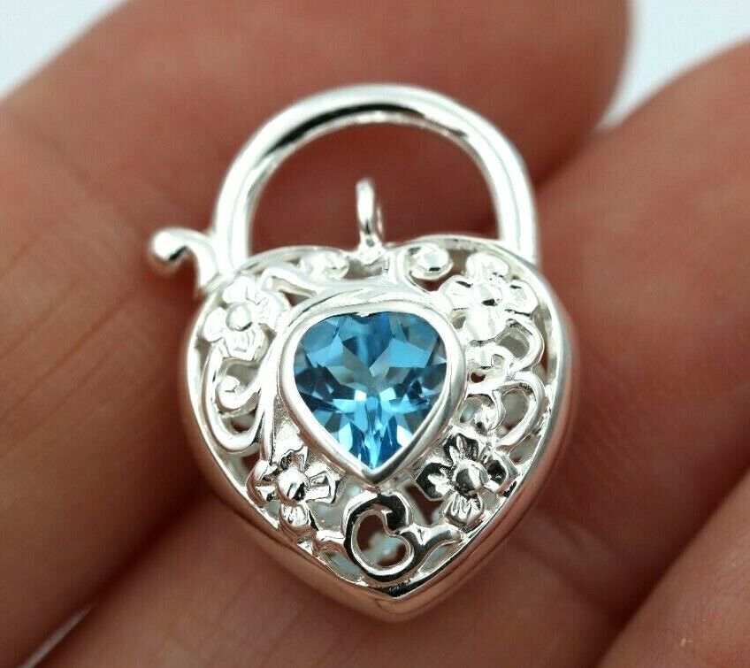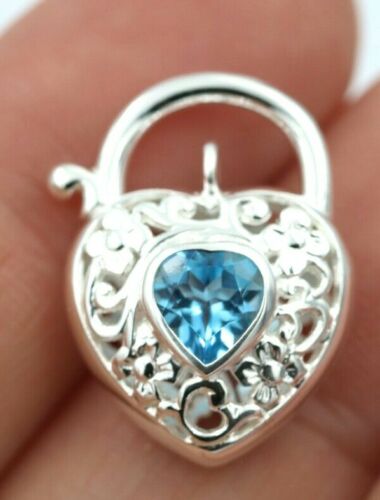 Sterling Silver Filigree Natural Blue Topaz Filigree Heart Padlock 15mm