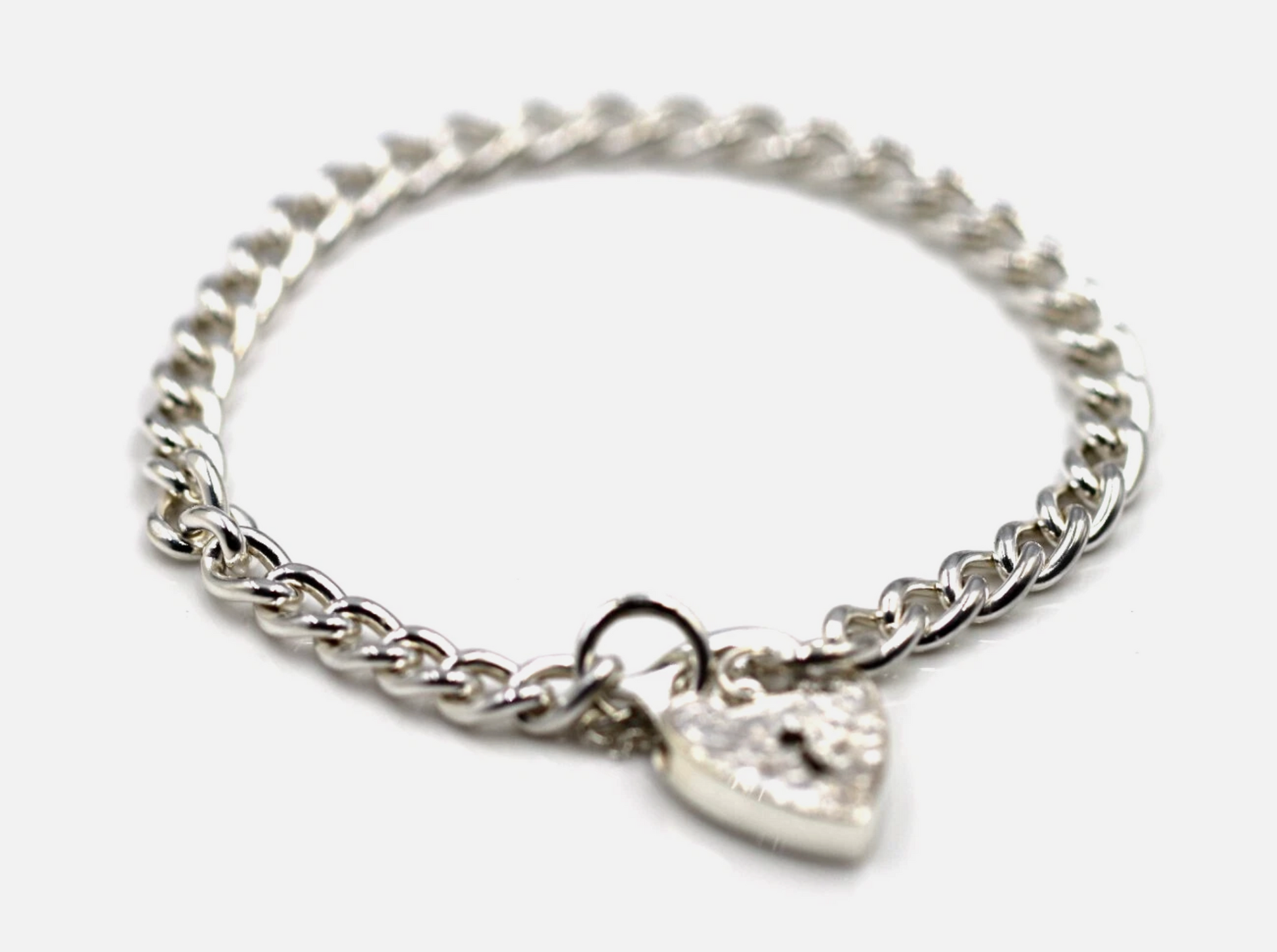 Genuine 925 Sterling Silver Curb Link Heart Padlock Bracelet
