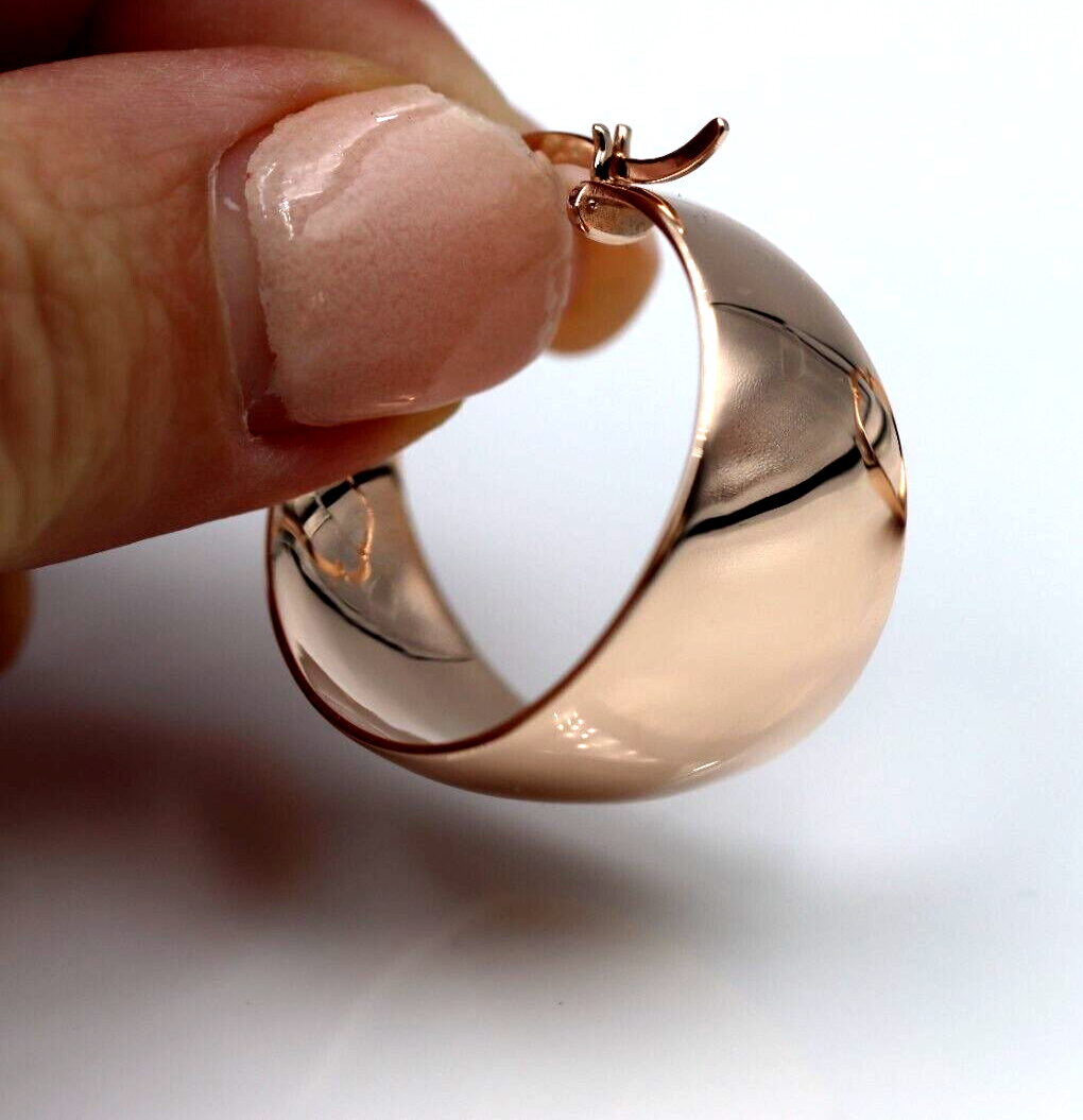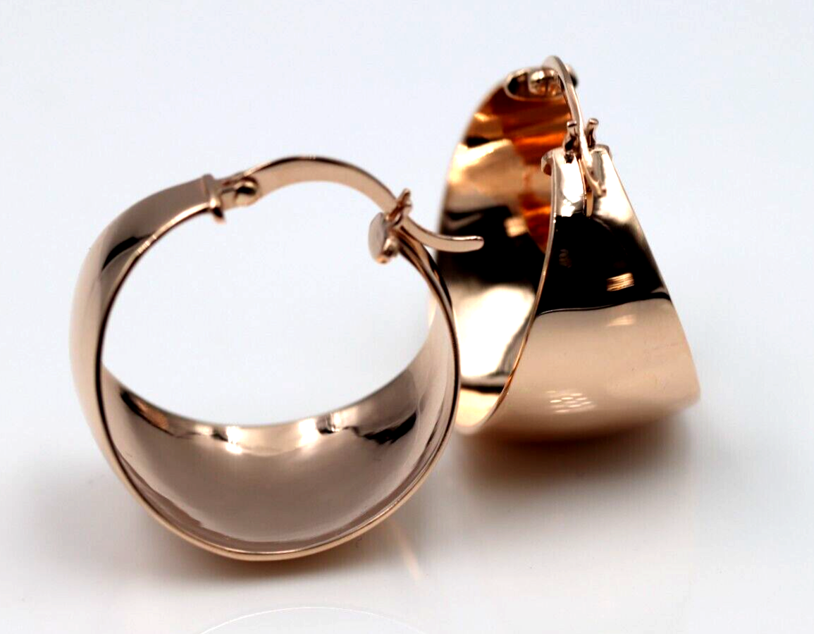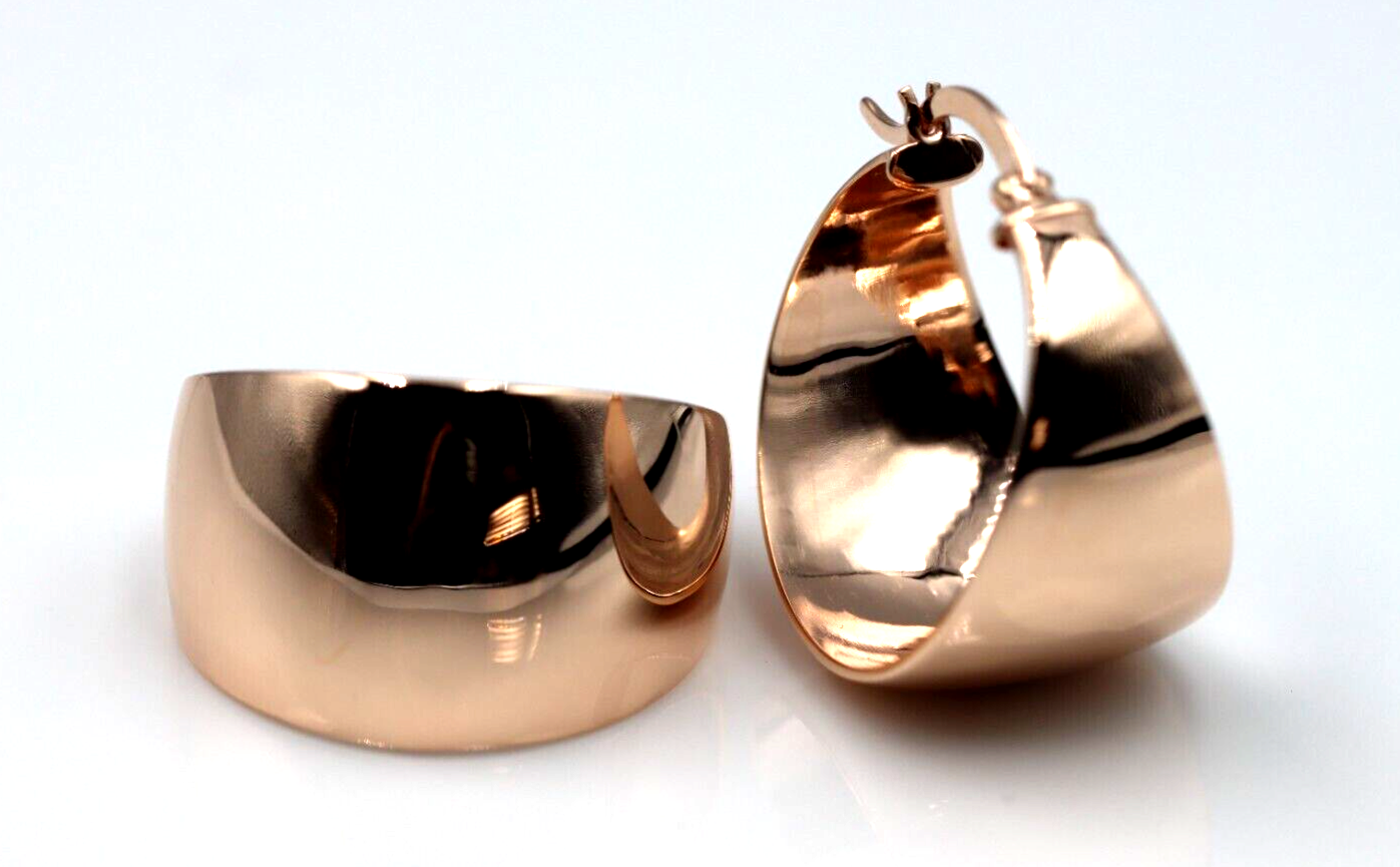 These 9ct rose gold hoop earrings are sure to make a statement. Crafted with solid gold for maximum durability, the hefty 13 to 14g weight ensures these will be a staple in your jewelry collection. The wide design creates a timeless, luxurious look and feel.