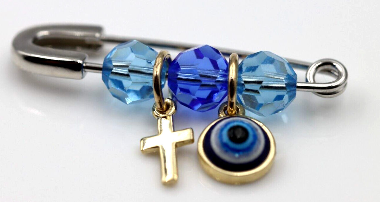 9ct Yellow GOLD - Genuine gold not plated or bonded HALLMARKED 375 (Evil eye and cross are both 9ct gold.) The pin is sterling silver 925 |