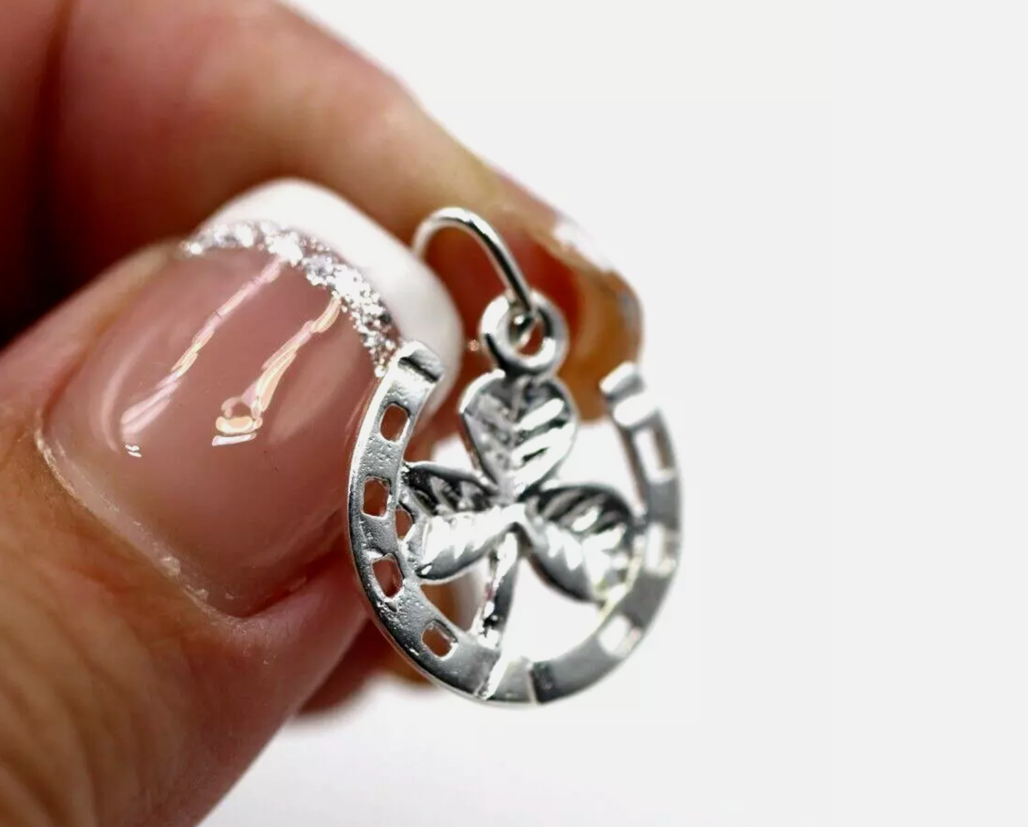 Genuine Sterling Silver 925 Lucky Leaf Clover inside Horseshoe Pendant