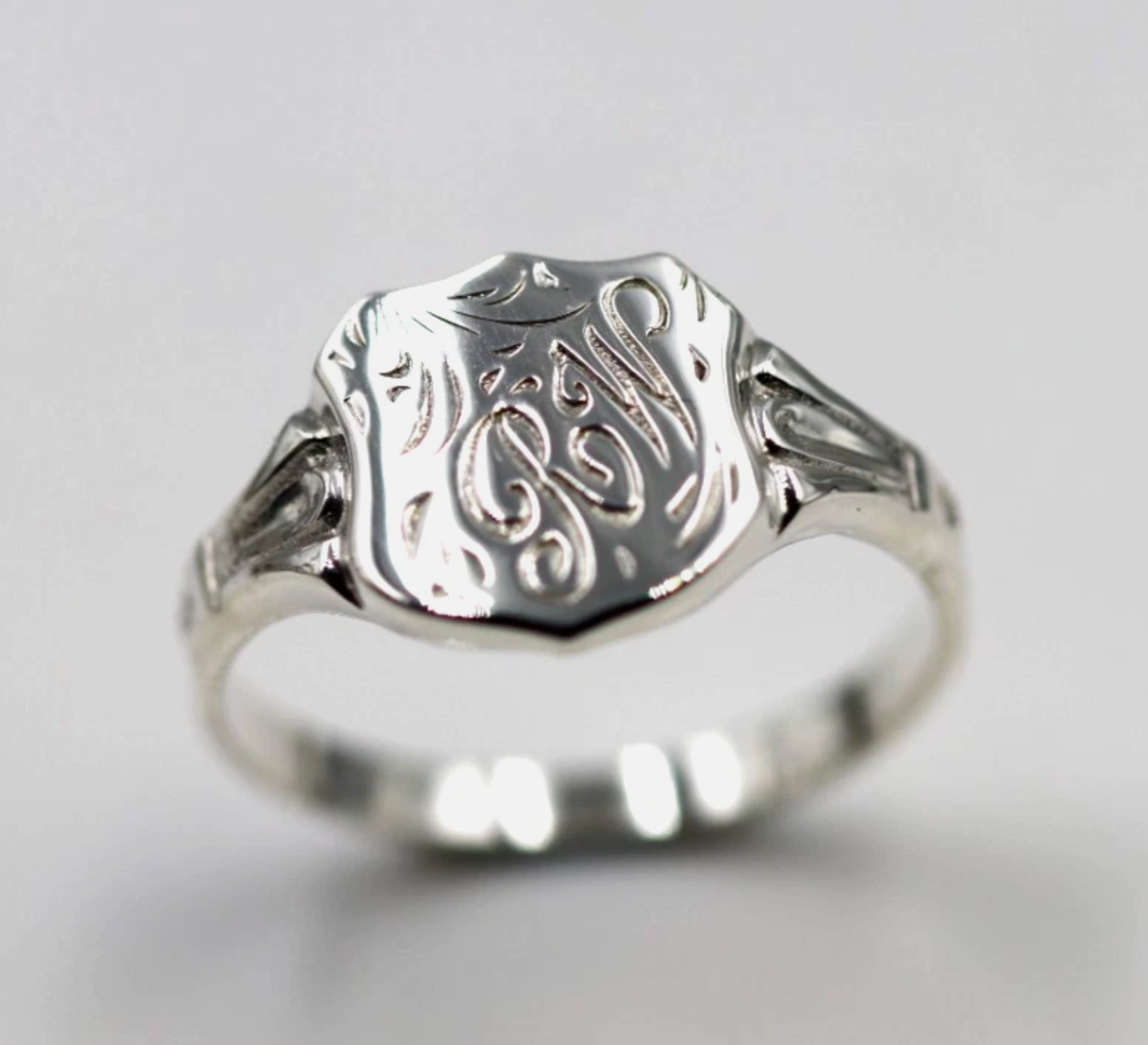 1.2cm x 1.1cm size of shield width of band 2mm Choose your ring size Price includes engraving of 2 initials |
