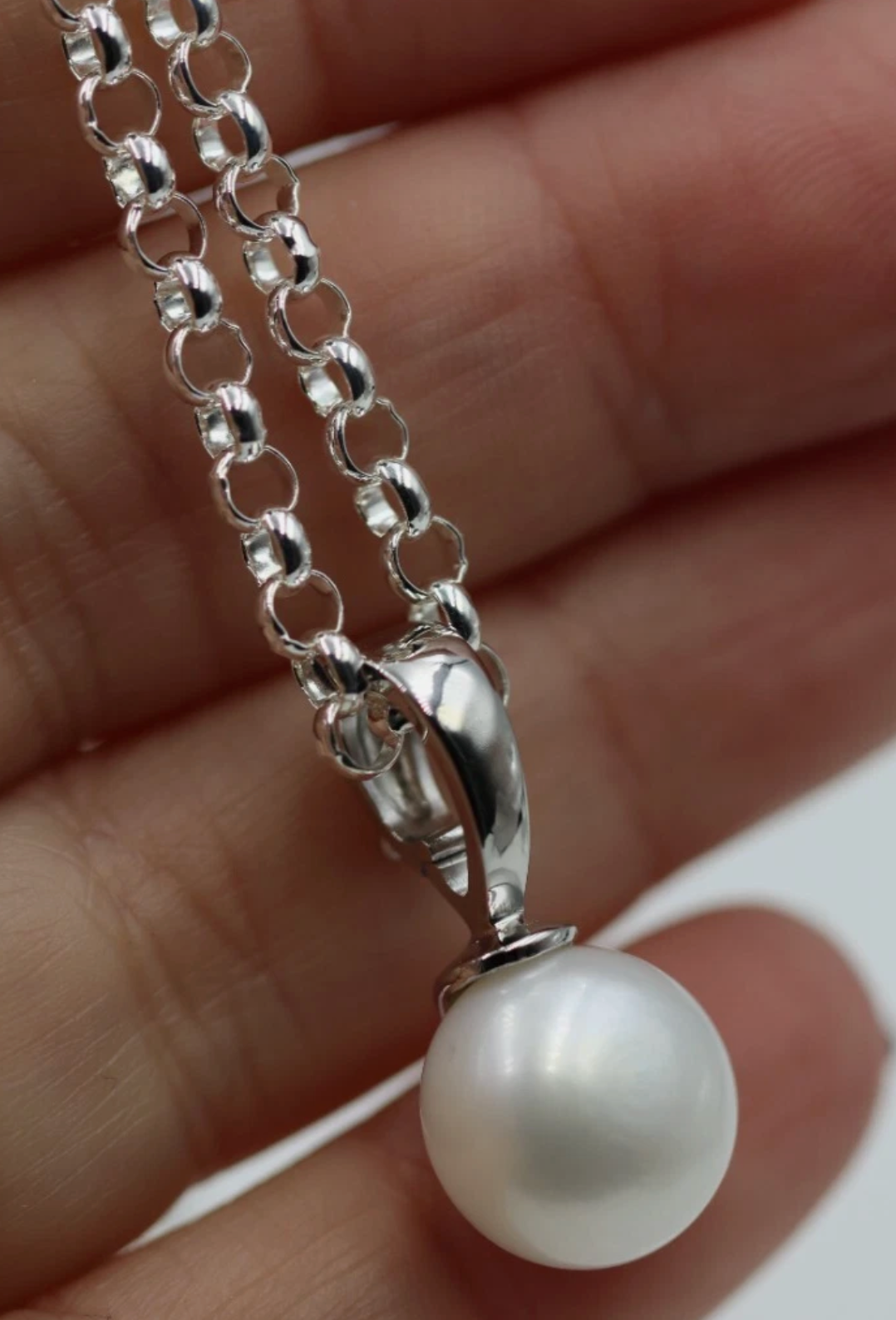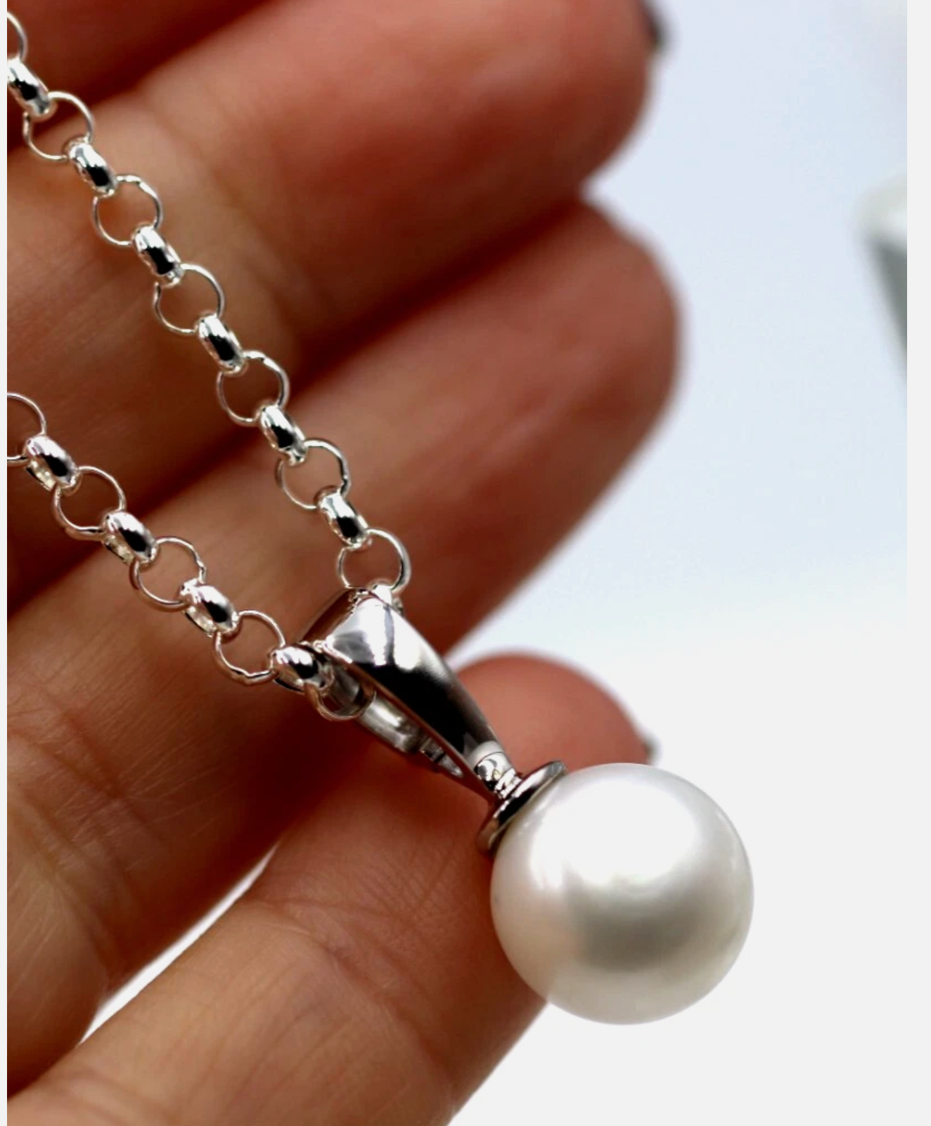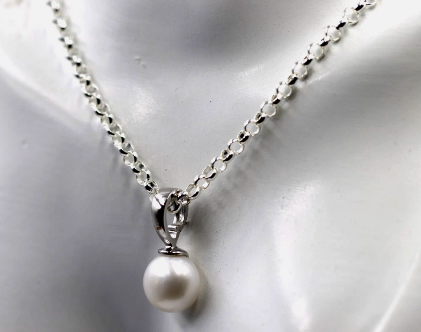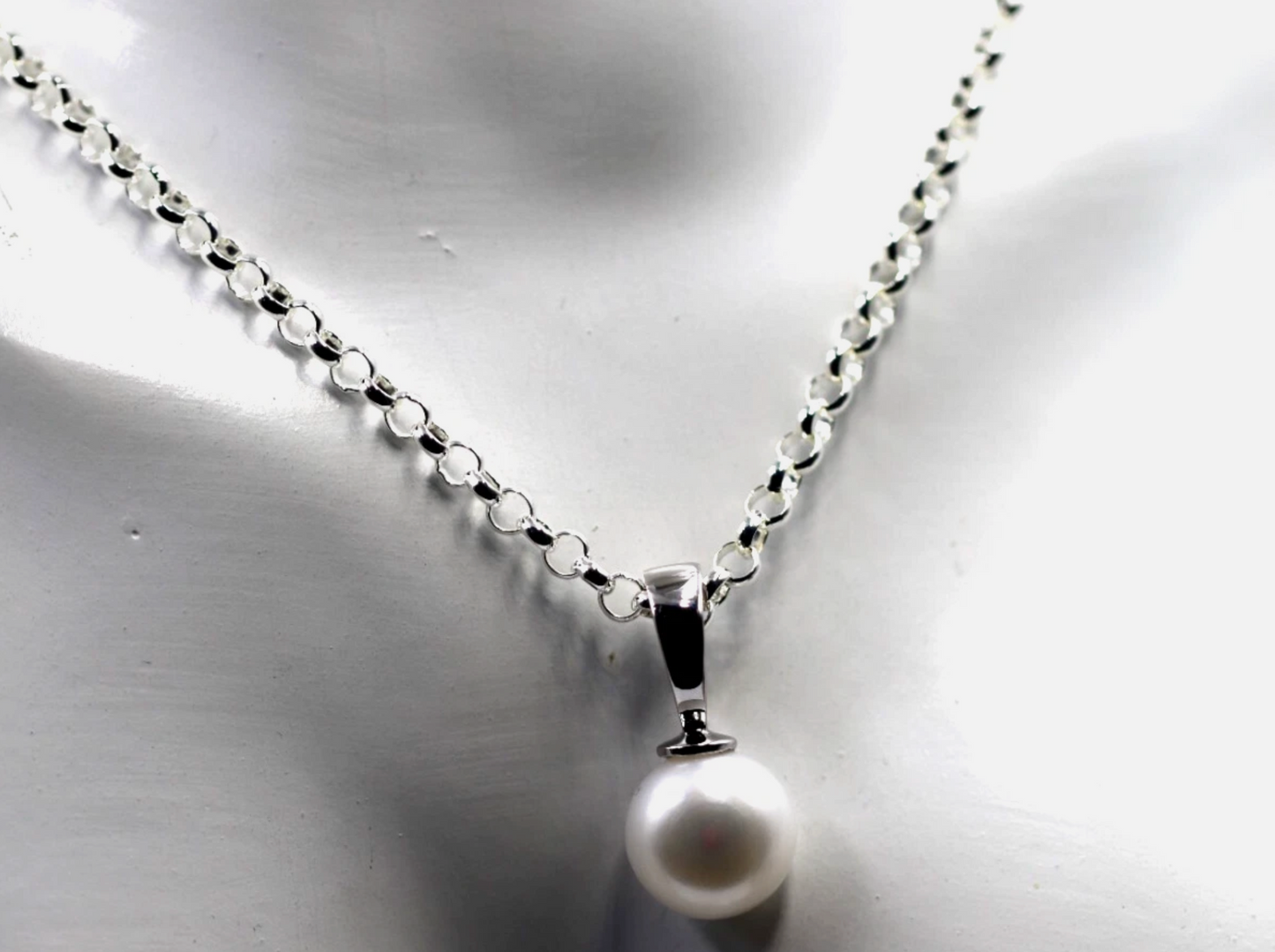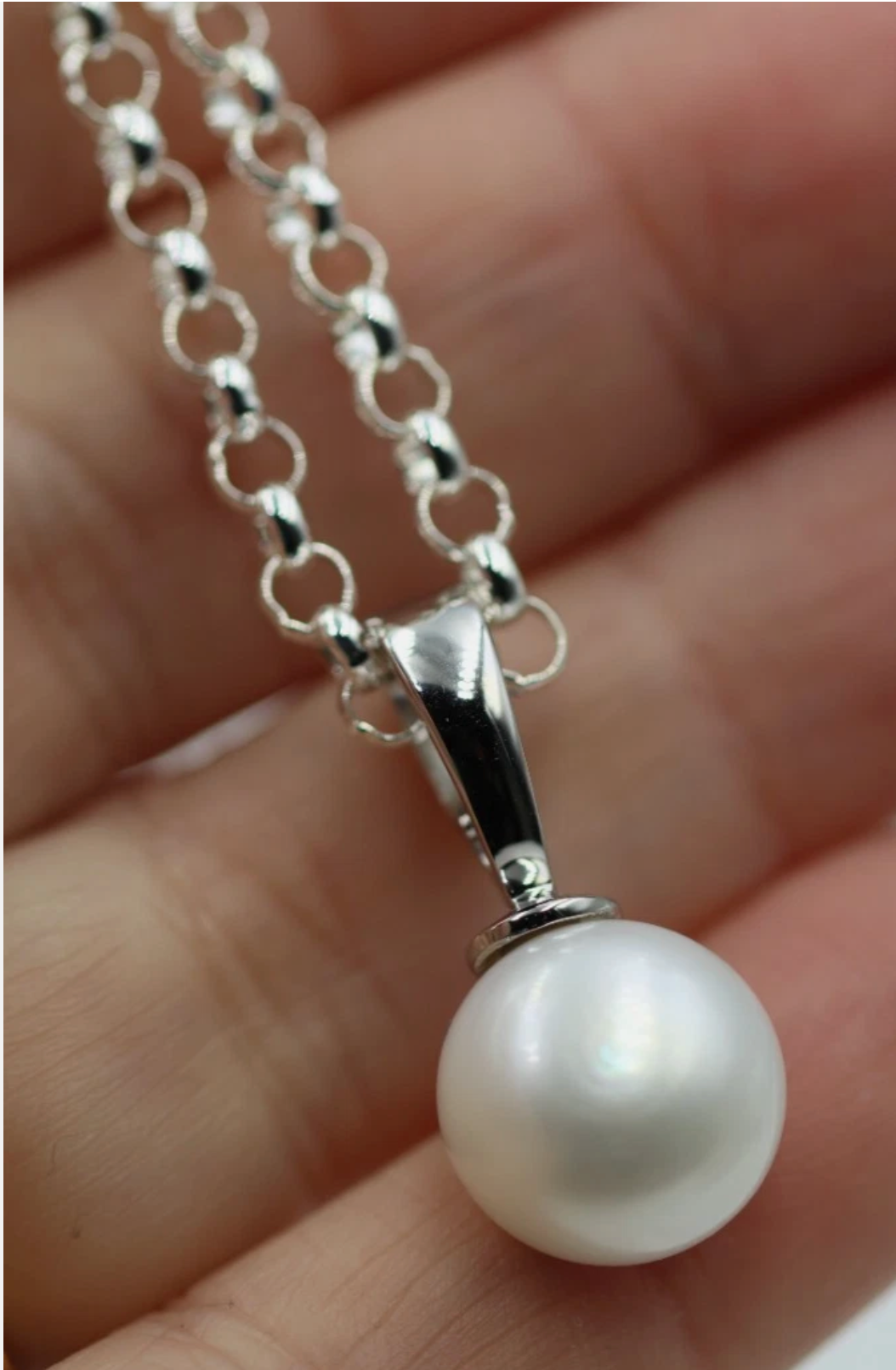 Sterling Silver 925 12mm Button Pearl Ball Pendant + Chain Necklace