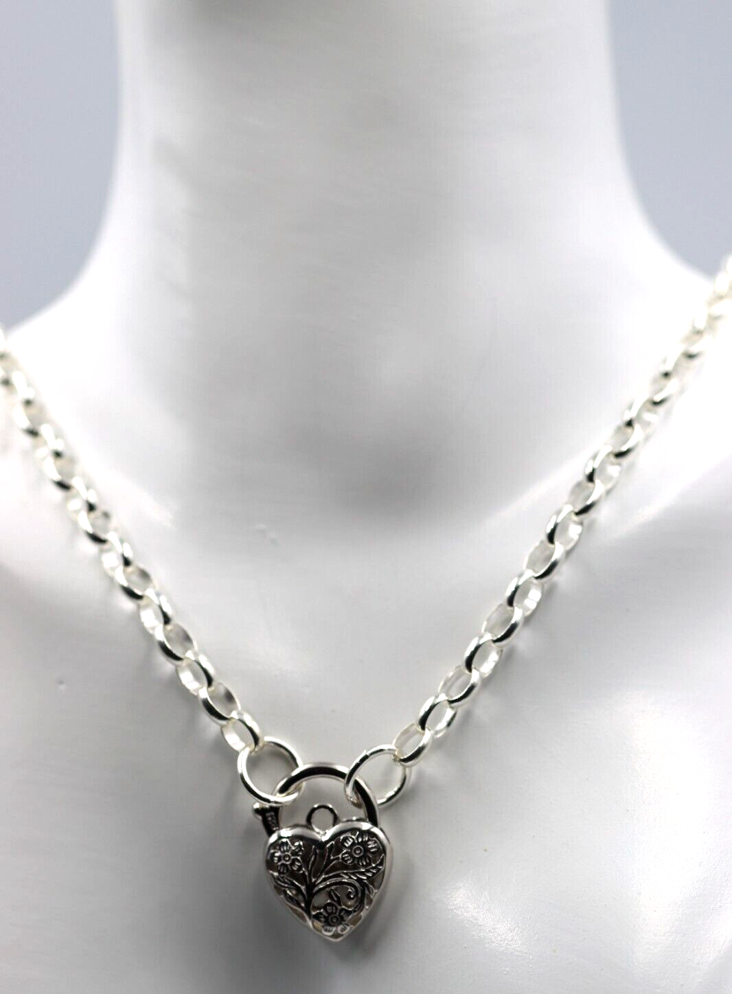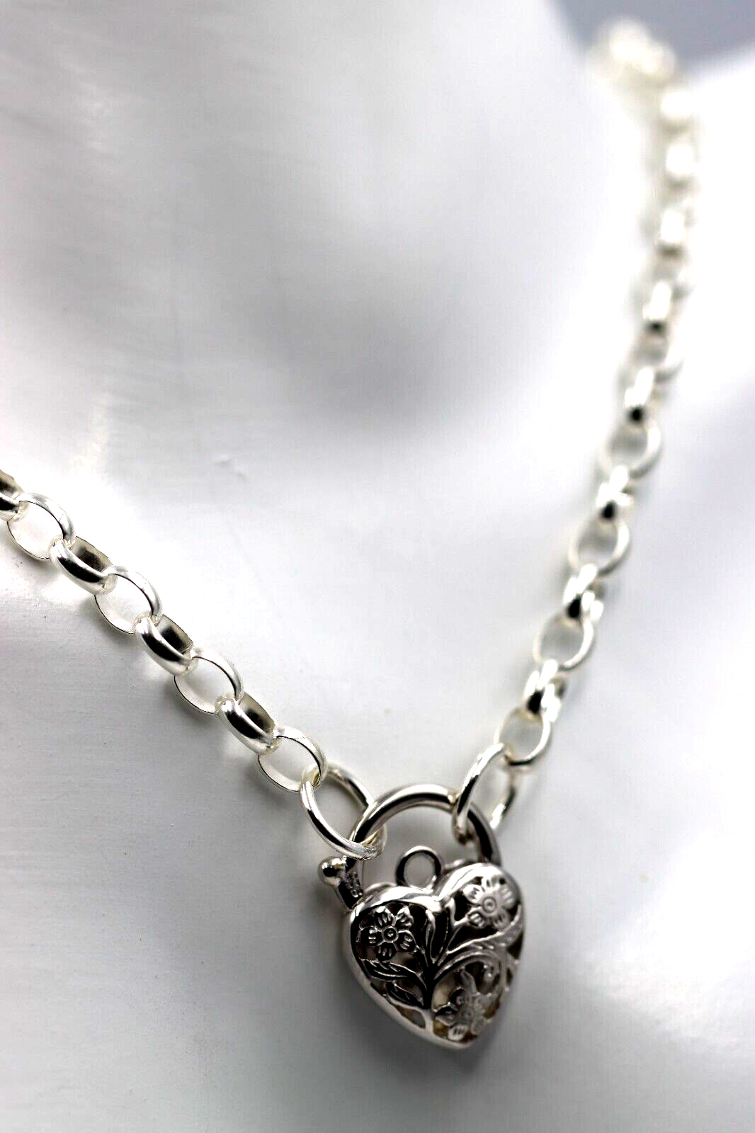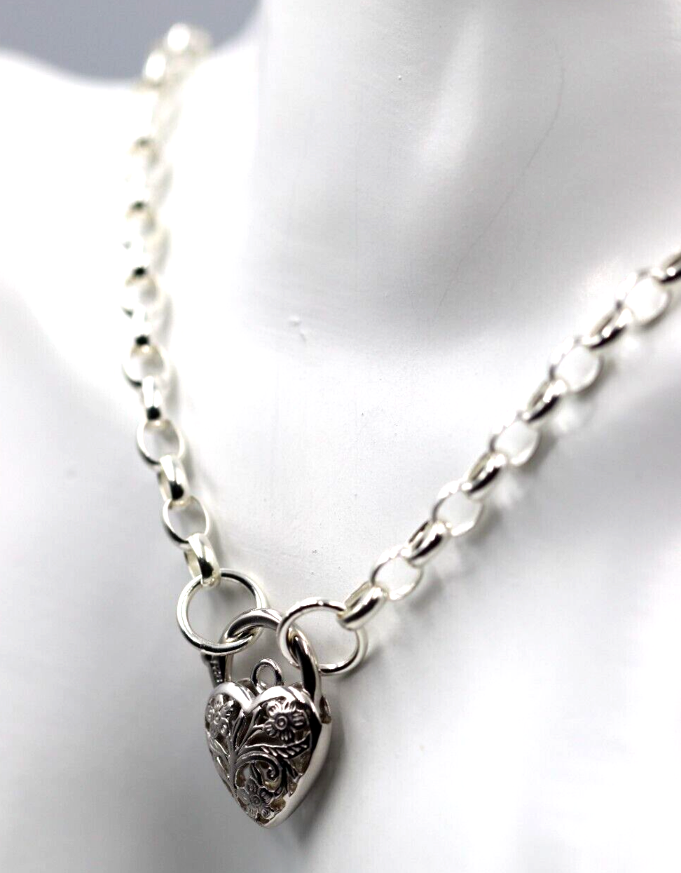 Sterling Silver 925 Belcher Link Chain Necklace + Filigree Heart Pendant