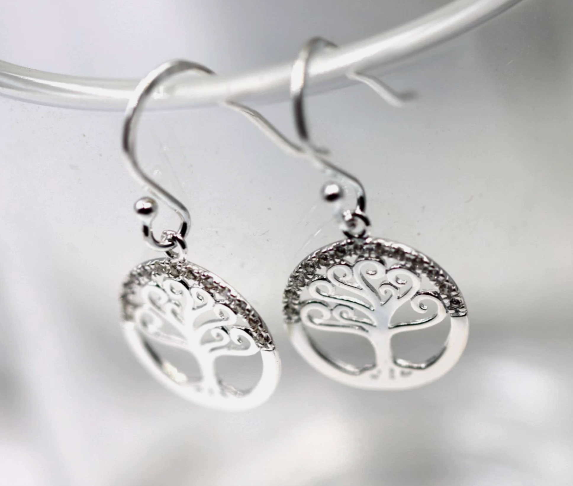 Sterling Silver 925 CZ Tree of Life Hook Drop Earrings 13mm