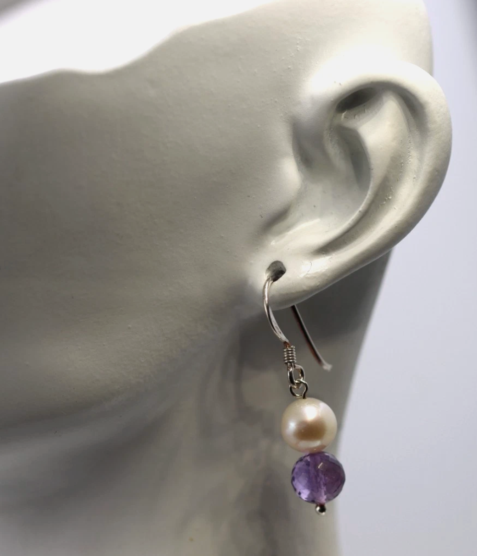 Sterling Silver 925 Freshwater White Pearl + Amethyst Ball Earrings