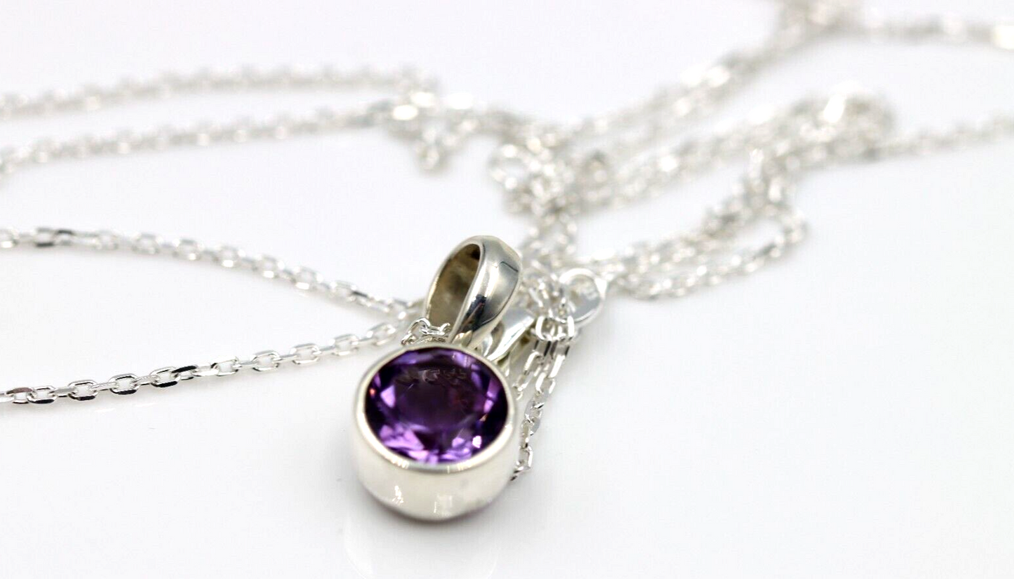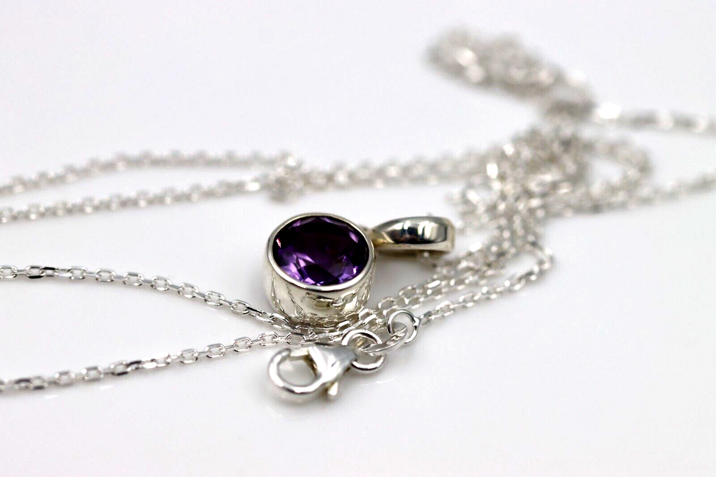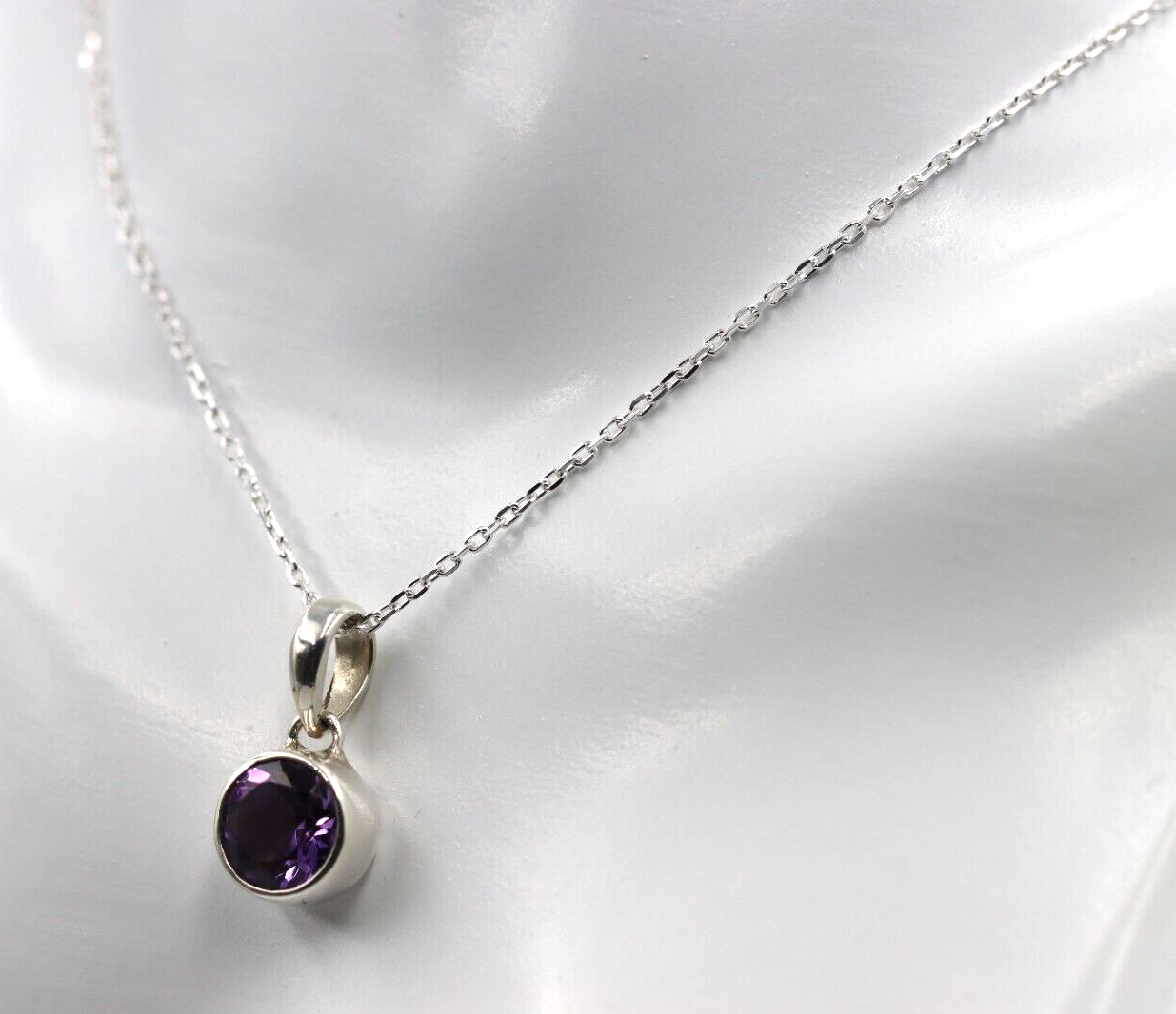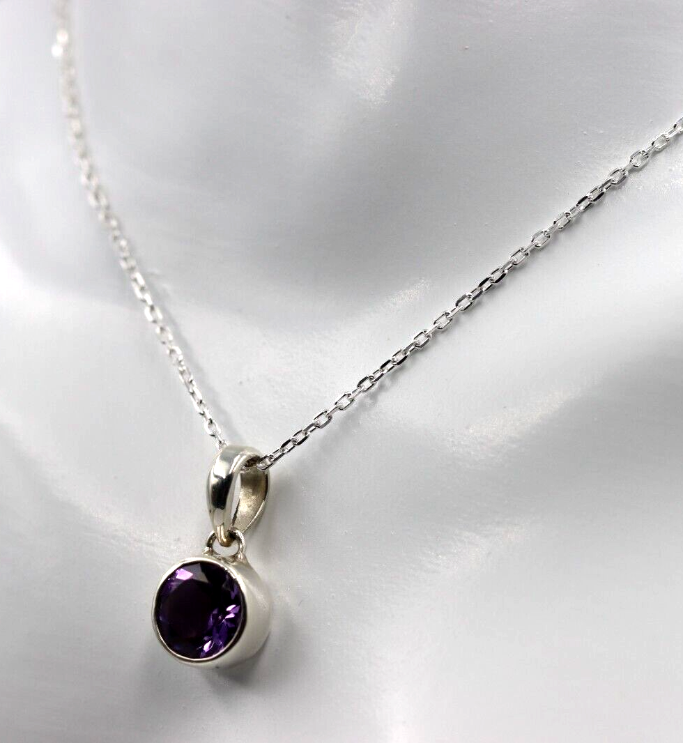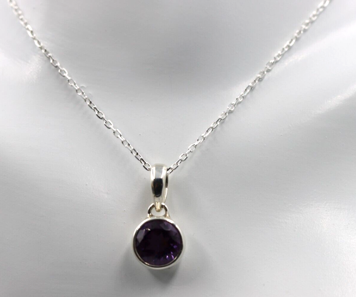 Sterling Silver 925 Round Amethyst Pendant & 65cm Chain Necklace